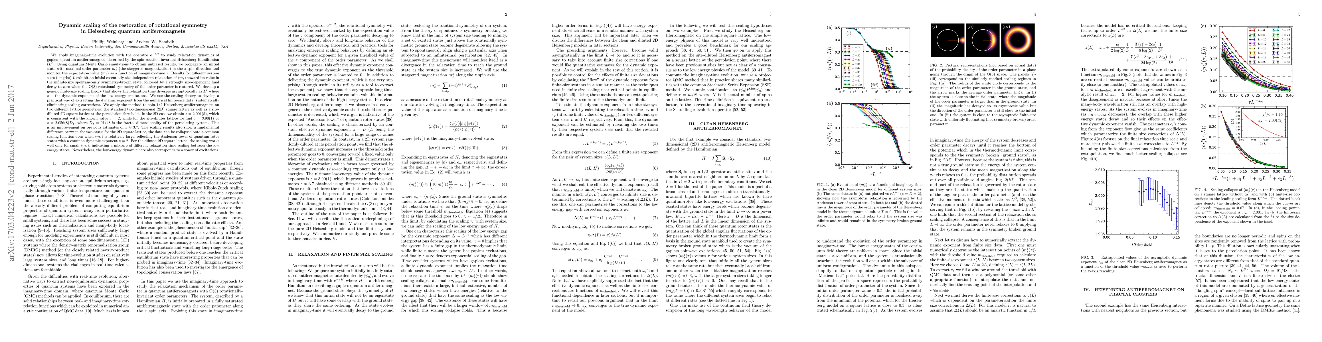 We apply imaginary-time evolution, ${\rm e}^{-\tau H}$, to study relaxation dynamics of gapless quantum antiferromagnets described by the spin-rotation invariant Heisenberg Hamiltonian ($H$). Using quantum Monte Carlo simulations, we propagate an initial state with maximal order parameter $m^z_s$ (the staggered magnetization) in the $z$ spin direction and monitor the expectation value $\langle m^z_s\rangle $ as a function of the time $\tau$. Different system sizes of lengths $L$ exhibit an initial size-independent relaxation of $\langle m^z_s\rangle$ toward its value the spontaneously symmetry-broken state, followed by a size-dependent final decay to zero. We develop a generic finite-size scaling theory which shows that the relaxation time diverges asymptotically as $L^z$ where $z$ is the dynamic exponent of the low energy excitations. We use the scaling theory to develop a way of extracting the dynamic exponent from the numerical finite-size data. We apply the method to spin-$1/2$ Heisenberg antiferromagnets on two different lattice geometries; the two-dimensional (2D) square lattice as well as a site-diluted square lattice at the percolation threshold. In the 2D case we obtain $z=2.001(5)$, which is consistent with the known value $z=2$, while for the site-dilutes lattice we find $z=3.90(1)$. This is an improvement on previous estimates of $z\approx 3.7$. The scaling results also show a fundamental difference between the two cases: In the 2D system the data can be collapsed onto a common scaling function even when $\langle m^z_s\rangle$ is relatively large, reflecting the Anderson tower of quantum rotor states with a common dynamic exponent $z=2$. For the diluted lattice, the scaling works only for small $\langle m^z_s\rangle$, indicating a mixture of different relaxation time scaling between the low energy states.