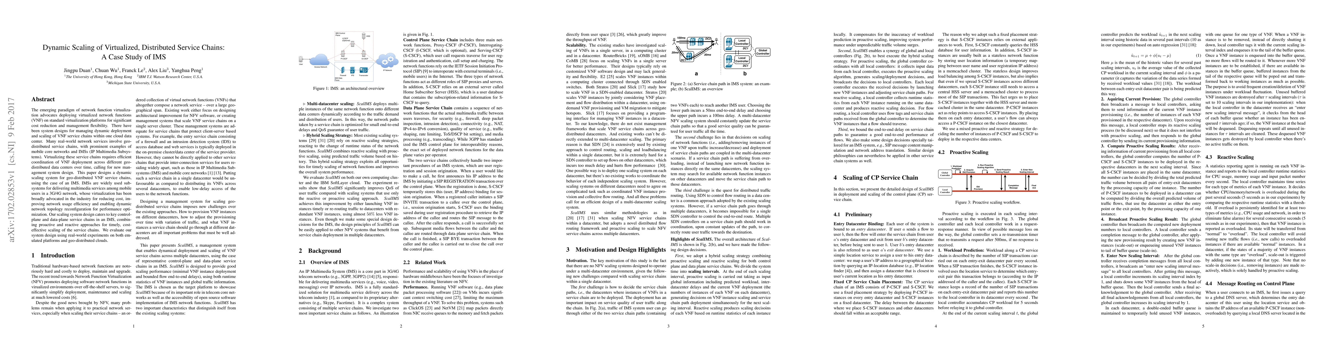 This paper presents a dynamic scaling system for virtualized, geo-distributed service chains, specifically focusing on the IP Multimedia Subsystem (IMS) used in mobile networks. The system combines proactive and reactive scaling approaches to optimize cost and performance.