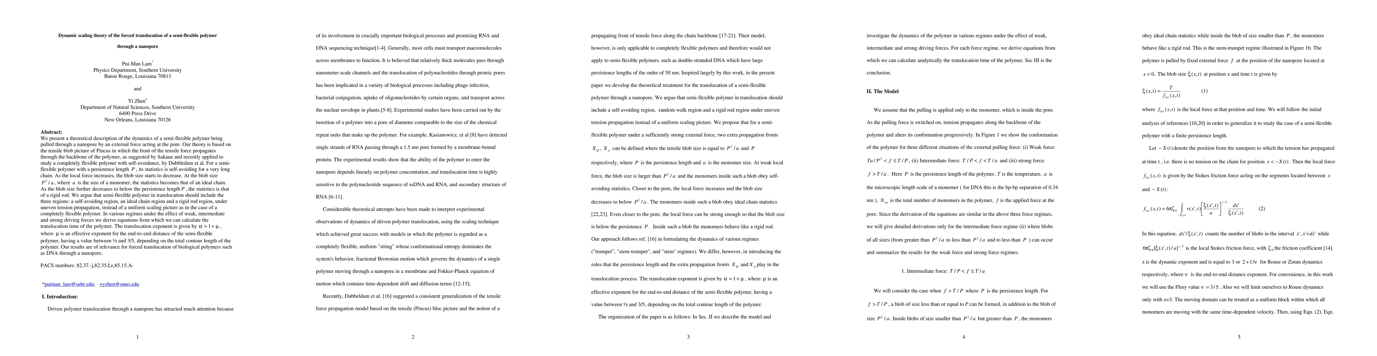 This paper presents a dynamic scaling theory for the forced translocation of semi-flexible polymers through nanopores, proposing a three-region model based on the tensile blob picture. The translocation time is calculated under different force regimes, yielding a translocation exponent dependent on the polymer's persistence length and contour length.