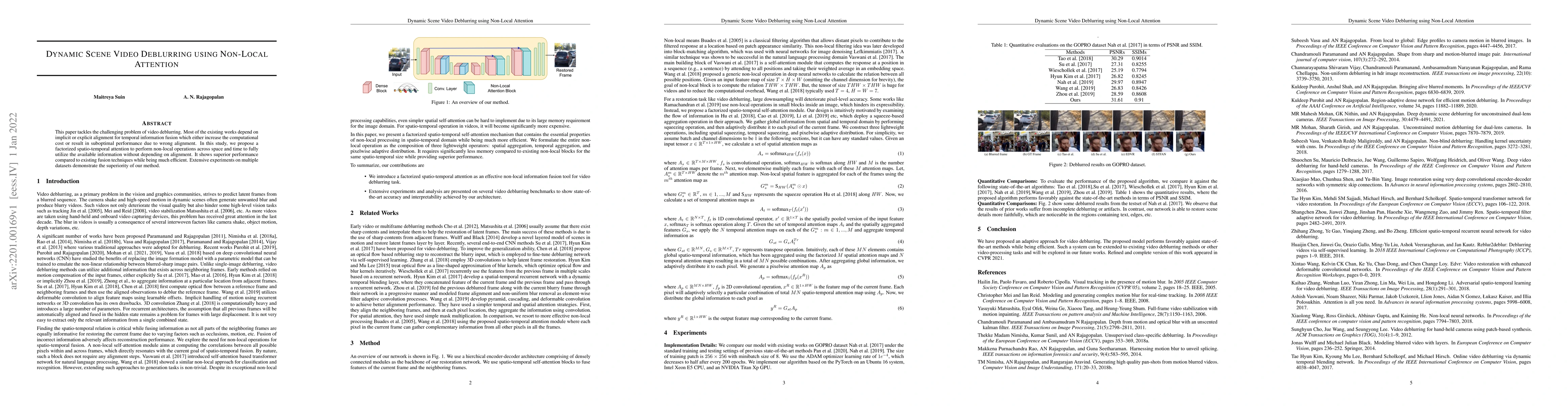 This paper tackles the challenging problem of video deblurring. Most of the existing works depend on implicit or explicit alignment for temporal information fusion which either increase the computational cost or result in suboptimal performance due to wrong alignment. In this study, we propose a factorized spatio-temporal attention to perform non-local operations across space and time to fully utilize the available information without depending on alignment. It shows superior performance compared to existing fusion techniques while being much efficient. Extensive experiments on multiple datasets demonstrate the superiority of our method.