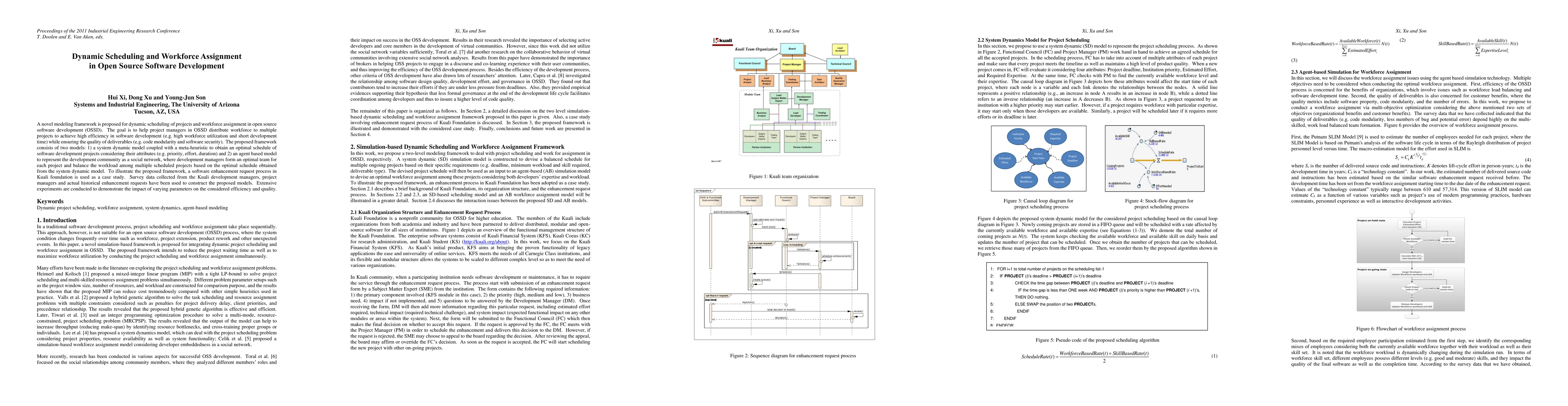 This paper proposes a modeling framework for dynamic scheduling and workforce assignment in open source software development, aiming to optimize project efficiency and quality. The framework includes a system dynamic model and a meta-heuristic for optimal scheduling, and an agent-based model to balance workloads among projects, demonstrated through a case study of Kuali foundation.
