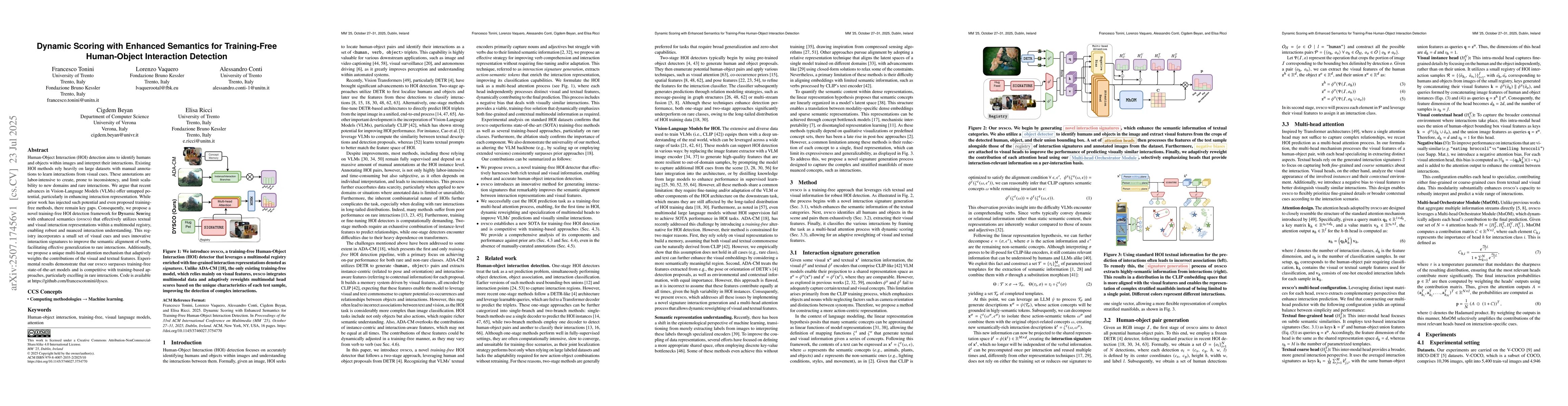 Human-Object Interaction (HOI) detection aims to identify humans and objects within images and interpret their interactions. Existing HOI methods rely heavily on large datasets with manual annotations to learn interactions from visual cues. These annotations are labor-intensive to create, prone to inconsistency, and limit scalability to new domains and rare interactions. We argue that recent advances in Vision-Language Models (VLMs) offer untapped potential, particularly in enhancing interaction representation. While prior work has injected such potential and even proposed training-free methods, there remain key gaps. Consequently, we propose a novel training-free HOI detection framework for Dynamic Scoring with enhanced semantics (DYSCO) that effectively utilizes textual and visual interaction representations within a multimodal registry, enabling robust and nuanced interaction understanding. This registry incorporates a small set of visual cues and uses innovative interaction signatures to improve the semantic alignment of verbs, facilitating effective generalization to rare interactions. Additionally, we propose a unique multi-head attention mechanism that adaptively weights the contributions of the visual and textual features. Experimental results demonstrate that our DYSCO surpasses training-free state-of-the-art models and is competitive with training-based approaches, particularly excelling in rare interactions. Code is available at https://github.com/francescotonini/dysco.