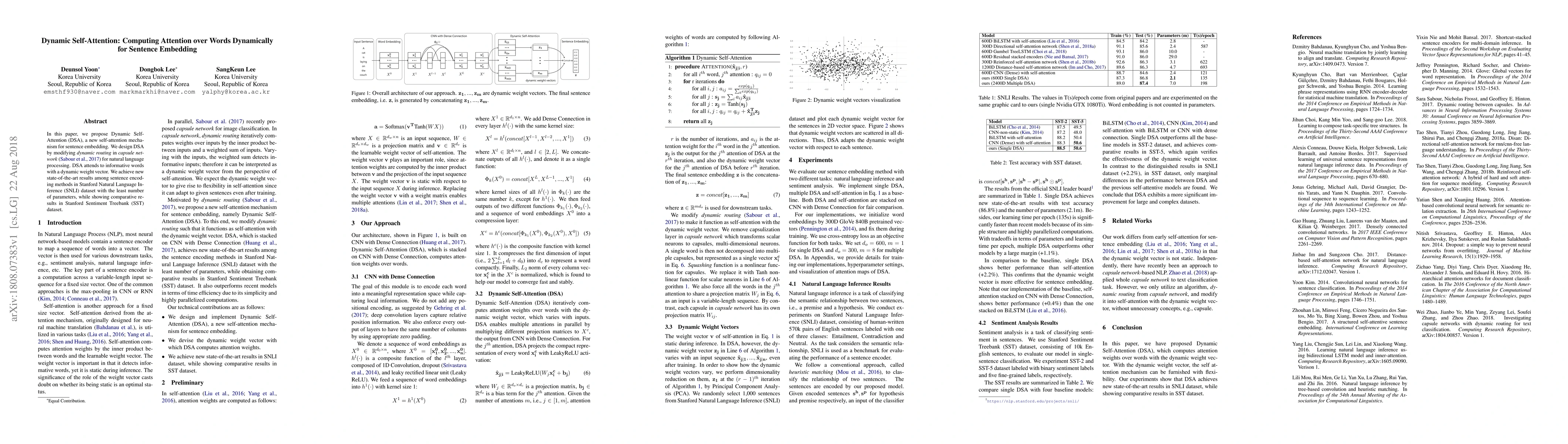 This paper introduces Dynamic Self-Attention (DSA), a novel self-attention mechanism for sentence embedding that dynamically assigns weights to informative words, achieving state-of-the-art results on the SNLI dataset with fewer parameters while showing competitive performance on the SST dataset.