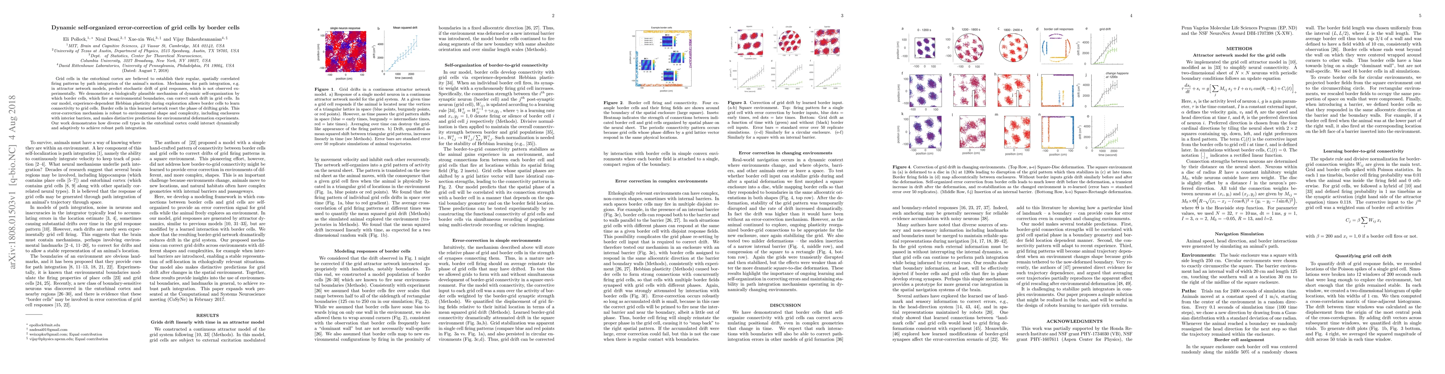 This paper proposes a dynamic self-organization mechanism where border cells correct the drift in grid cells' firing patterns, enabling robust path integration. Border cells learn to reset drifting grid cells through experience-dependent Hebbian plasticity, offering a biologically plausible solution to observed discrepancies in grid cell stability.