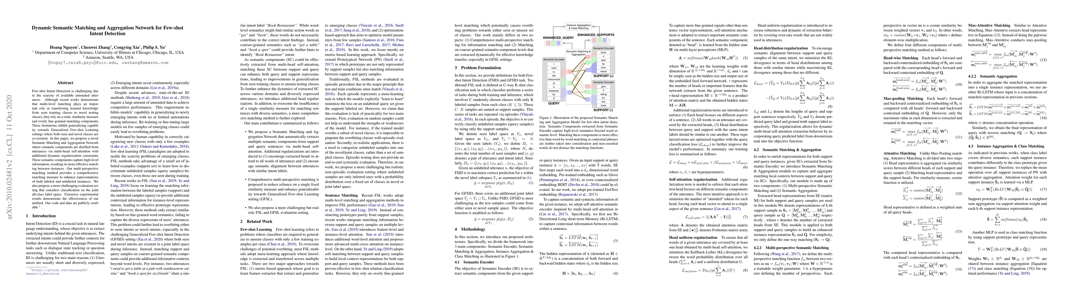 The paper introduces a new method for few-shot intent detection that uses dynamic semantic components and multi-perspective matching to better identify intents with limited data. Experiments show this approach improves performance, especially in more challenging scenarios involving both new and known classes.