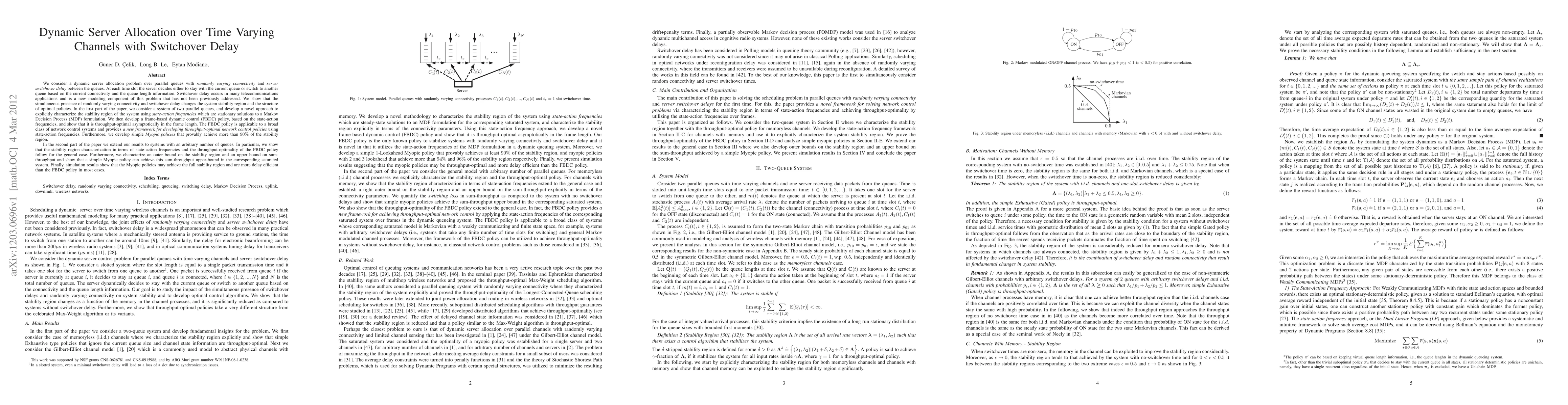 This paper addresses dynamic server allocation over time-varying channels with switchover delay, focusing on parallel queues with varying connectivity. It develops a novel approach to characterize stability regions using state-action frequencies and introduces a frame-based dynamic control policy that is throughput-optimal. The study extends these findings to systems with multiple queues.