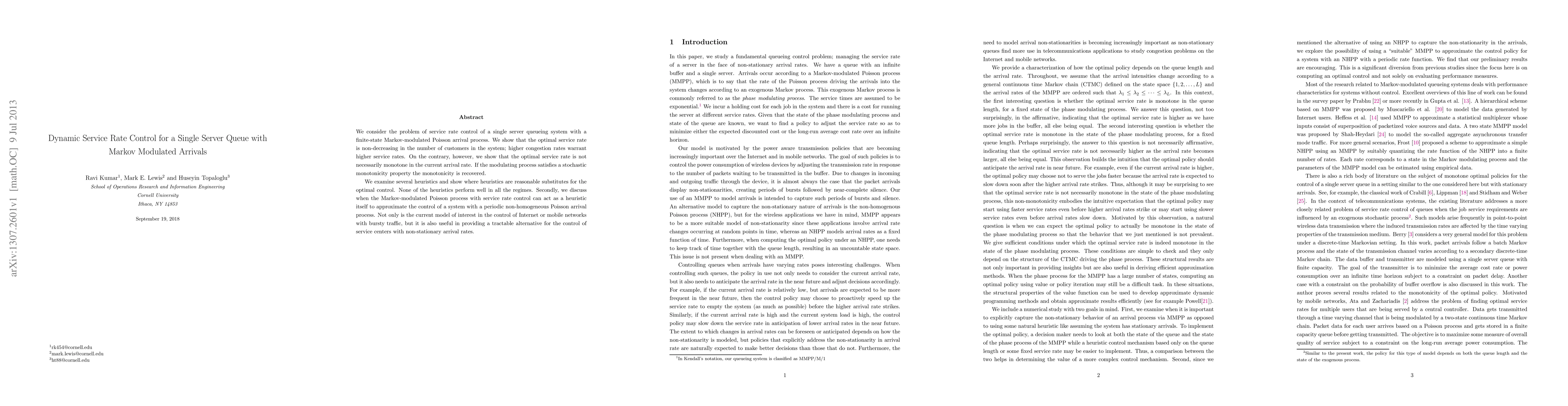 This paper explores dynamic service rate control in a single server queue with Markov-modulated Poisson arrivals, demonstrating that optimal service rates increase with congestion but not necessarily with arrival rates. It also evaluates heuristics and finds they are not universally effective, while noting the model's applicability to Internet and mobile network traffic control.