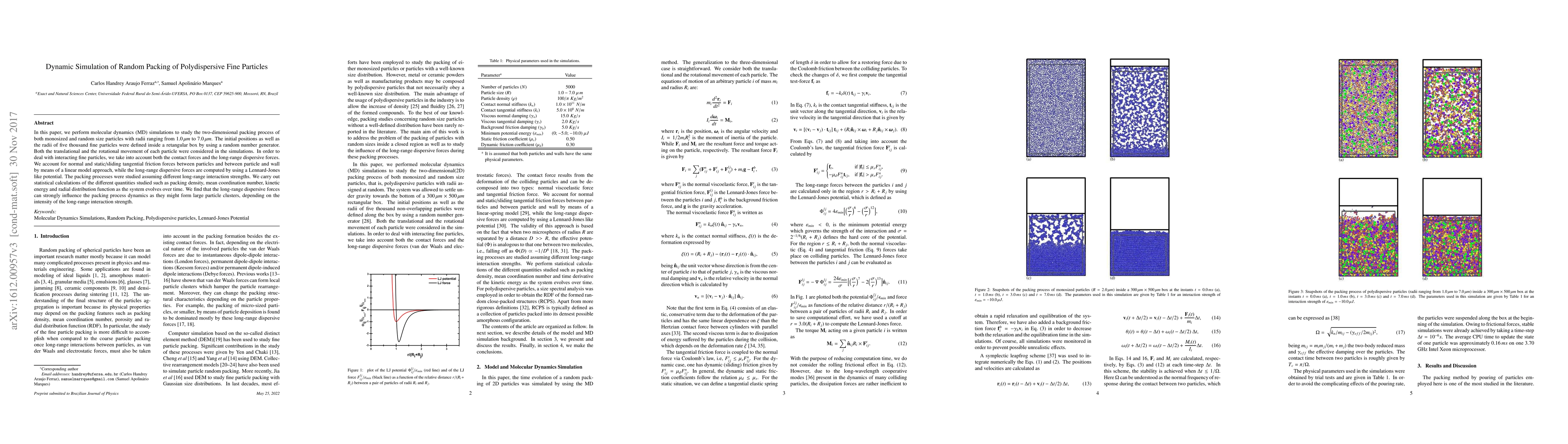 In this paper, we perform molecular dynamics (MD) simulations to study the two-dimensional packing process of both monosized and random size particles with radii ranging from $1.0 \, \mu m$ to $7.0 \, \mu m$. The system was allowed to settle under gravity towards the bottom of a $300 \, \mu m \times 500 \, \mu m$ rectangular box. The initial positions as well as the radii of five thousand fine particles were defined along the box by using a random number generator. Both the translational and the rotational movement of each particle were considered in the simulations. In order to deal with interacting fine particles, we take into account both the contact forces and the long-range dispersive forces. We account for normal and static/sliding tangential friction forces between particles and between particle and wall by means of a linear model approach, while the long-range dispersive forces are computed by using a Lennard-Jones like potential. The packing processes were studied assuming different long- range interaction strengths. We carry out statistical calculations of the different quantities studied such as packing density, mean coordination number and time derivative of the kinetic energy as the system evolves over time. A size spectral analysis was employed to obtain the radial distribution function (RDF) of the random close-packed structures (RCPS) for the case of random size particles. We find that the long-range dispersive forces can strongly influence the packing process dynamics as they might form large particle clusters, depending on the intensity of the long-range interaction strength. However, the general shape of the RDFs for the RCPS is seen to be more influenced by the hardness of the particles than by the long-range dispersive forces.