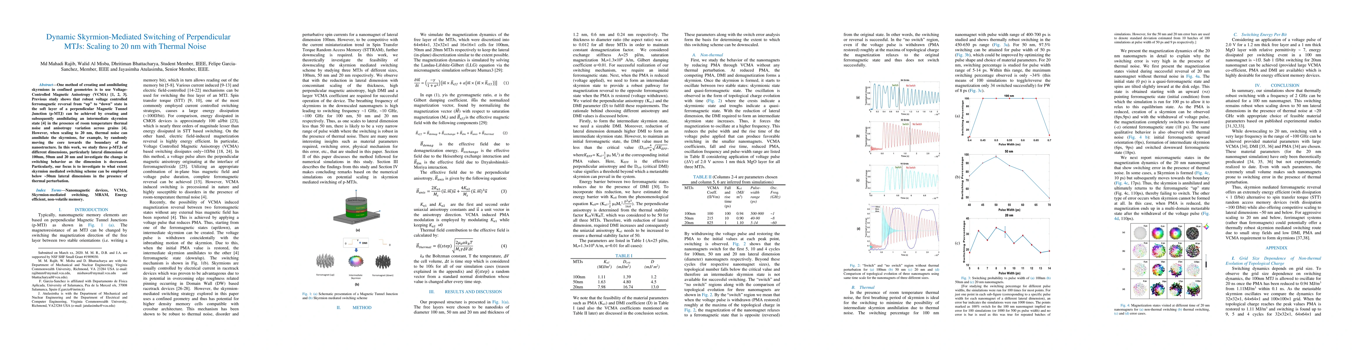 One method of creating and annihilating skyrmions in confined geometries is to use Voltage-Controlled Magnetic Anisotropy (VCMA) [1, 2, 3]. Previous study shows that robust voltage controlled ferromagnetic reversal from up to down state in the soft layer of a perpendicular Magnetic Tunnel Junction (p-MTJ) can be achieved by creating and subsequently annihilating an intermediate skyrmion state [4] in the presence of room temperature thermal noise and anisotropy variation across grains [4]. However, when scaling to 20 nm, thermal noise can annihilate the skyrmions, for example, by randomly moving the core towards the boundary of the nanostructure. In this work, we study three p-MTJs of different dimensions, particularly lateral dimensions of 100nm, 50nm and 20 nm and investigate the change in switching behavior as the dimension is decreased. Particularly, our focus is to investigate to what extent skyrmion mediated switching scheme can be employed below ~50nm lateral dimensions in the presence of thermal perturbation.