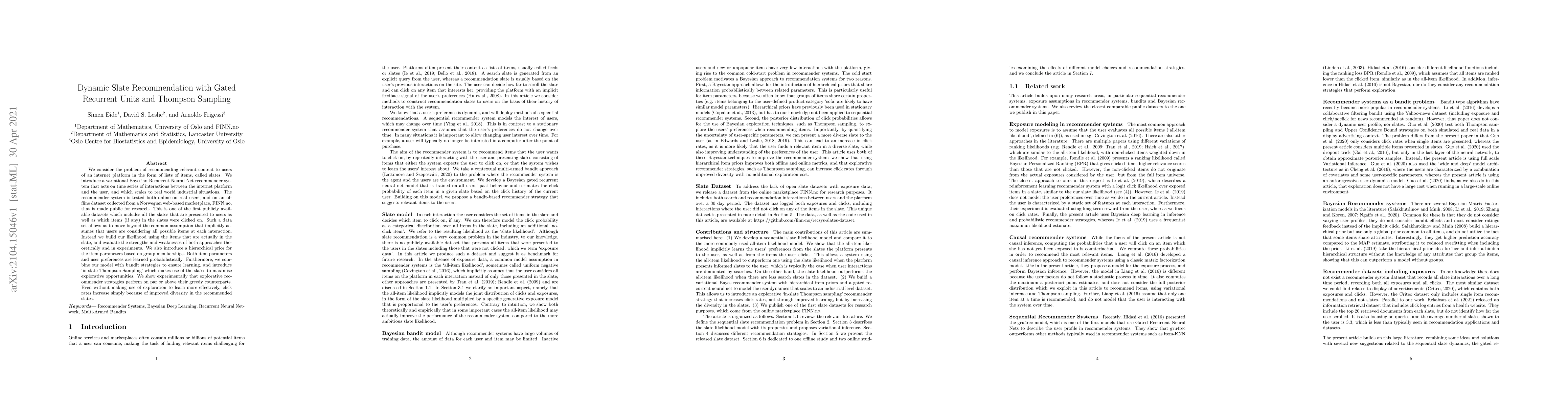 We consider the problem of recommending relevant content to users of an internet platform in the form of lists of items, called slates. We introduce a variational Bayesian Recurrent Neural Net recommender system that acts on time series of interactions between the internet platform and the user, and which scales to real world industrial situations. The recommender system is tested both online on real users, and on an offline dataset collected from a Norwegian web-based marketplace, FINN.no, that is made public for research. This is one of the first publicly available datasets which includes all the slates that are presented to users as well as which items (if any) in the slates were clicked on. Such a data set allows us to move beyond the common assumption that implicitly assumes that users are considering all possible items at each interaction. Instead we build our likelihood using the items that are actually in the slate, and evaluate the strengths and weaknesses of both approaches theoretically and in experiments. We also introduce a hierarchical prior for the item parameters based on group memberships. Both item parameters and user preferences are learned probabilistically. Furthermore, we combine our model with bandit strategies to ensure learning, and introduce `in-slate Thompson Sampling' which makes use of the slates to maximise explorative opportunities. We show experimentally that explorative recommender strategies perform on par or above their greedy counterparts. Even without making use of exploration to learn more effectively, click rates increase simply because of improved diversity in the recommended slates.