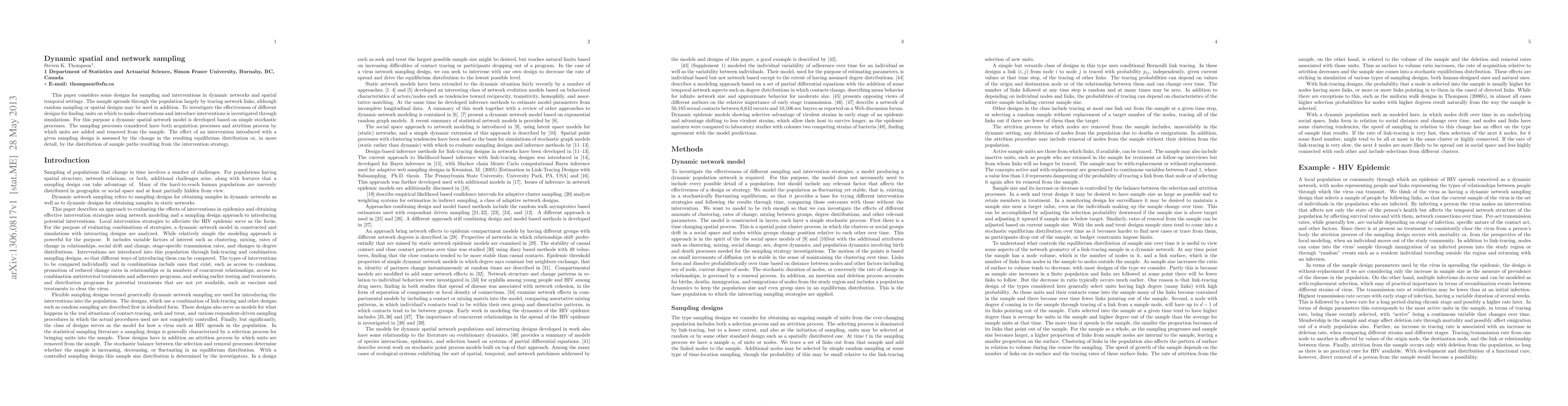 This paper considers some designs for sampling and interventions in dynamic networks and spatial temporal settings. The sample spreads through the population largely by tracing network links, although random sampling or spatial designs may be used in addition. To investigate the effectiveness of different designs for finding units on which to make observations and introduce interventions is investigated through simulations. For this purpose a dynamic spatial network model is developed based on simple stochastic processes. The sampling processes considered have both acquisition processes and attrition process by which units are added and removed from the sample. The effect of an intervention introduced with a given sampling design is assessed by the change in the resulting equilibrium distribution or, in more detail, by the distribution of sample paths resulting from the intervention strategy.