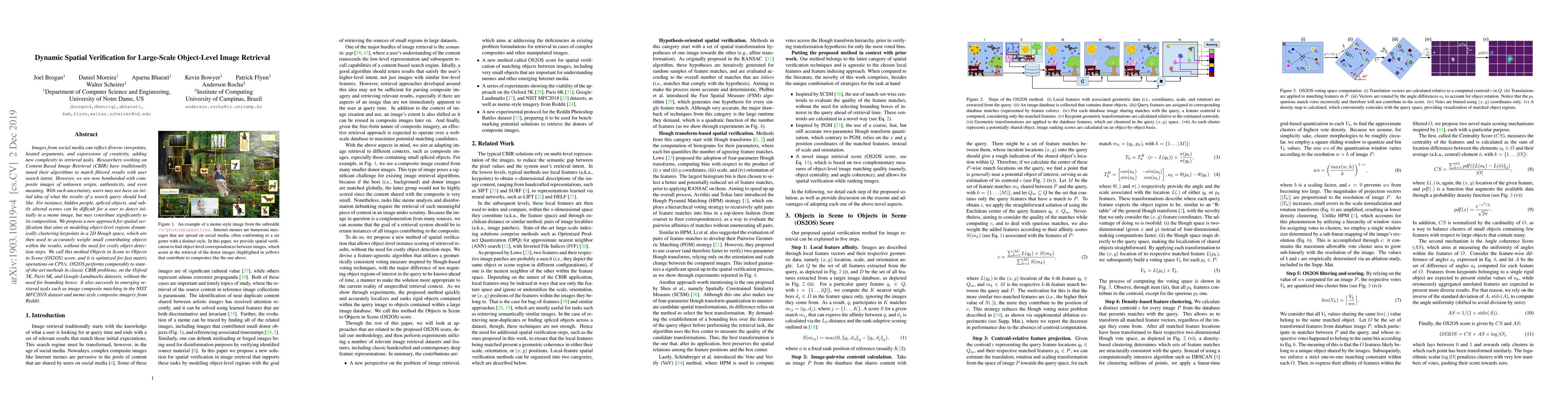Images from social media can reflect diverse viewpoints, heated arguments, and expressions of creativity, adding new complexity to retrieval tasks. Researchers working onContent-Based Image Retrieval (CBIR) have traditionally tuned their algorithms to match filtered results with user search intent. However, we are now bombarded with composite images of unknown origin, authenticity, and even meaning. With such uncertainty, users may not have an initial idea of what the results of a search query should look like. For instance, hidden people, spliced objects, and subtly altered scenes can be difficult for a user to detect initially in a meme image, but may contribute significantly to its composition. We propose a new approach for spatial verification that aims at modeling object-level regions dynamically clustering keypoints in a 2D Hough space, which are then used to accurately weight small contributing objects within the results, without the need for costly object detection steps. We call this method Objects in Scene to Objects in Scene (OS2OS) score, and it is optimized for fast matrix operations on CPUs. OS2OS performs comparably to state-of-the-art methods in classic CBIR problems, on the Oxford5K, Paris 6K, and Google-Landmarks datasets, without the need for bounding boxes. It also succeeds in emerging retrieval tasks such as image composite matching in the NIST MFC2018 dataset and meme-style composite imagery fromReddit.