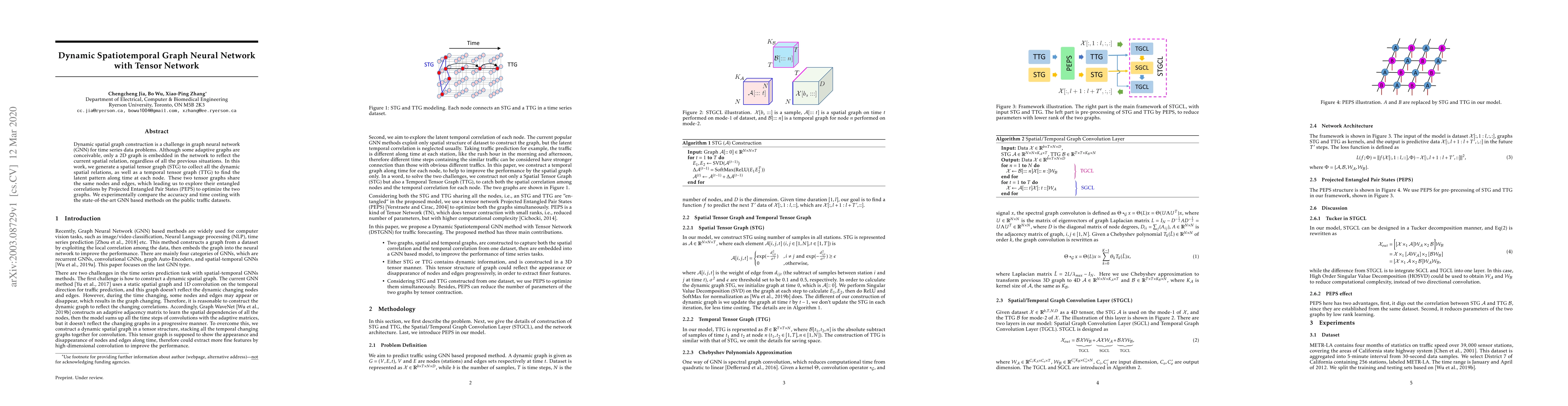 Dynamic spatial graph construction is a challenge in graph neural network (GNN) for time series data problems. Although some adaptive graphs are conceivable, only a 2D graph is embedded in the network to reflect the current spatial relation, regardless of all the previous situations. In this work, we generate a spatial tensor graph (STG) to collect all the dynamic spatial relations, as well as a temporal tensor graph (TTG) to find the latent pattern along time at each node. These two tensor graphs share the same nodes and edges, which leading us to explore their entangled correlations by Projected Entangled Pair States (PEPS) to optimize the two graphs. We experimentally compare the accuracy and time costing with the state-of-the-art GNN based methods on the public traffic datasets.