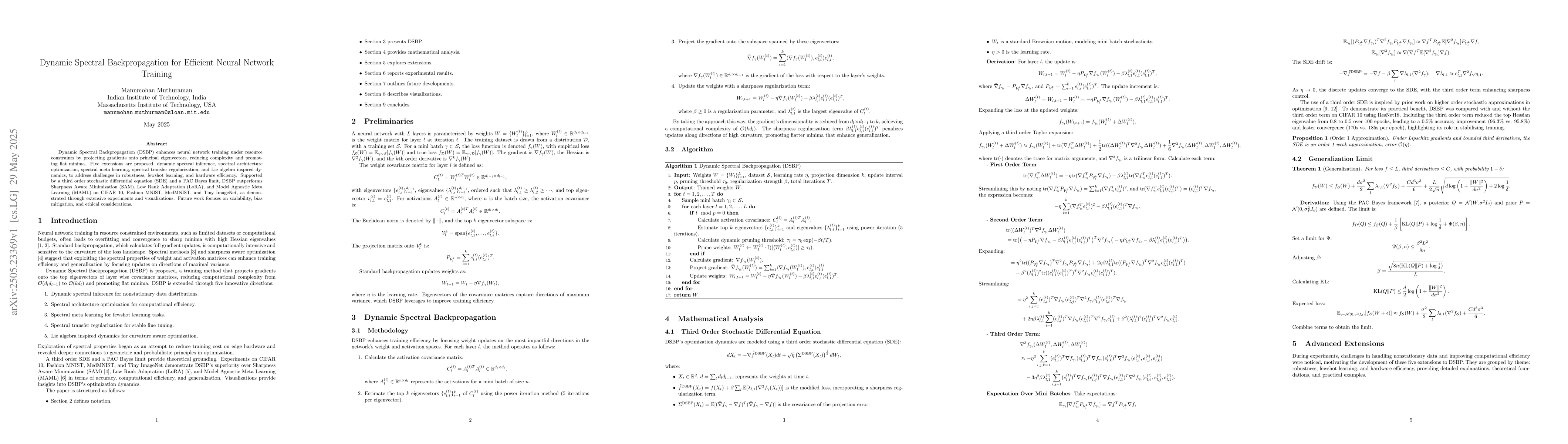 Dynamic Spectral Backpropagation (DSBP) enhances neural network training under resource constraints by projecting gradients onto principal eigenvectors, reducing complexity and promoting flat minima. Five extensions are proposed, dynamic spectral inference, spectral architecture optimization, spectral meta learning, spectral transfer regularization, and Lie algebra inspired dynamics, to address challenges in robustness, fewshot learning, and hardware efficiency. Supported by a third order stochastic differential equation (SDE) and a PAC Bayes limit, DSBP outperforms Sharpness Aware Minimization (SAM), Low Rank Adaptation (LoRA), and Model Agnostic Meta Learning (MAML) on CIFAR 10, Fashion MNIST, MedMNIST, and Tiny ImageNet, as demonstrated through extensive experiments and visualizations. Future work focuses on scalability, bias mitigation, and ethical considerations.