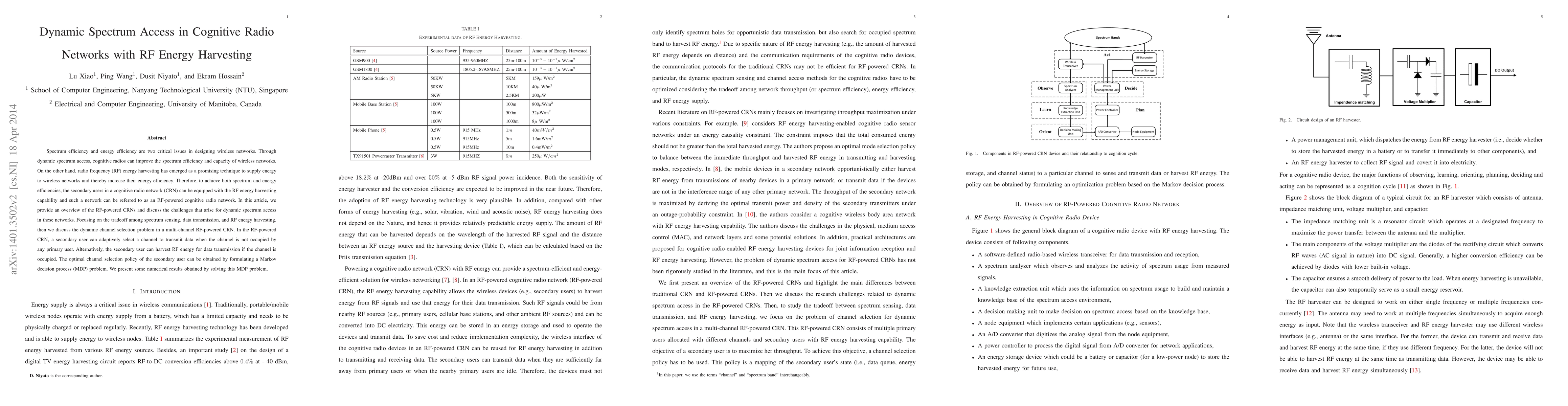 This paper reviews RF-powered cognitive radio networks that combine dynamic spectrum access with RF energy harvesting to enhance both spectrum and energy efficiency. It discusses the challenges and optimal channel selection strategies, formulated as a Markov decision process, to balance spectrum sensing, data transmission, and energy harvesting.