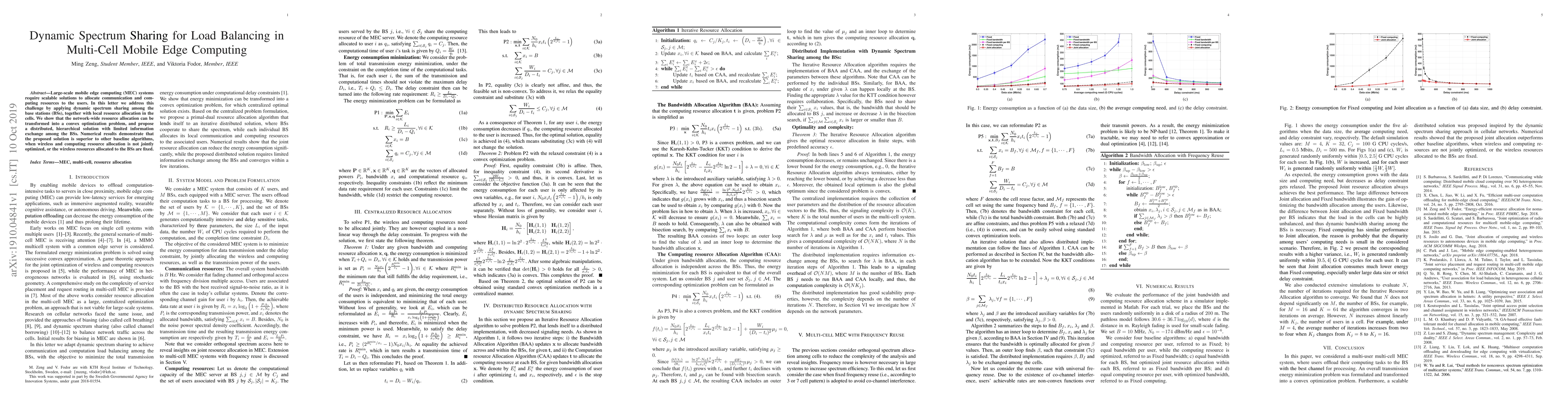This paper proposes a dynamic spectrum sharing strategy for load balancing in multi-cell mobile edge computing systems, transforming network-wide resource allocation into a convex optimization problem. The distributed, hierarchical solution with minimal information exchange among base stations outperforms other baseline algorithms in resource allocation.