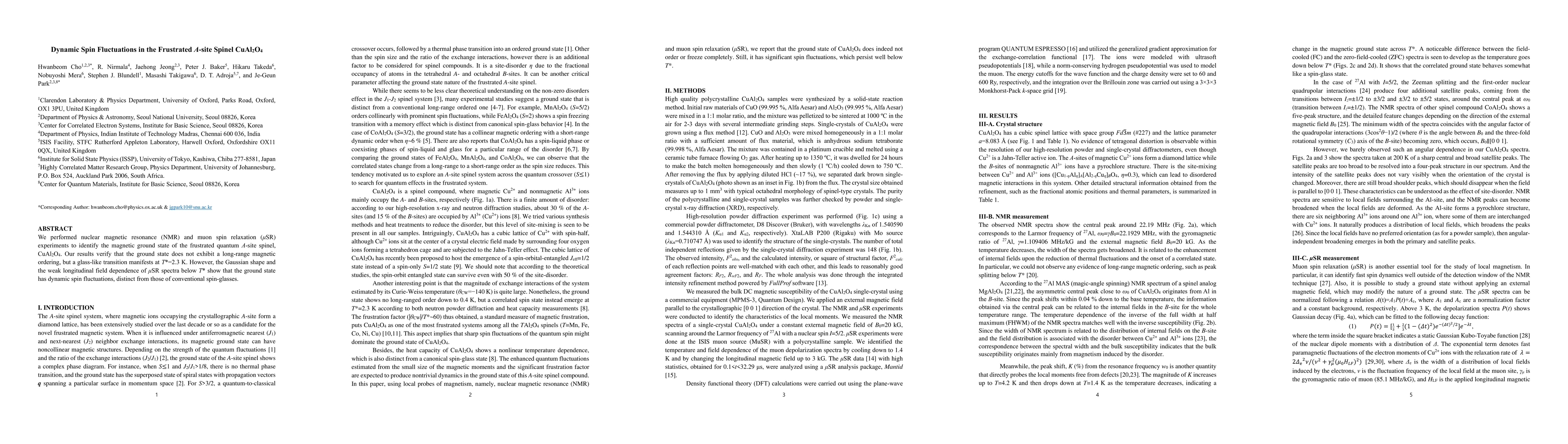We performed nuclear magnetic resonance (NMR) and muon spin relaxation ({\mu}SR) experiments to identify the magnetic ground state of the frustrated quantum A-site spinel, CuAl2O4. Our results verify that the ground state does not exhibit a long-range magnetic ordering, but a glass-like transition manifests at T*=2.3 K. However, the Gaussian shape and the weak longitudinal field dependence of {\mu}SR spectra below T* show that the ground state has dynamic spin fluctuations, distinct from those of conventional spin-glasses.