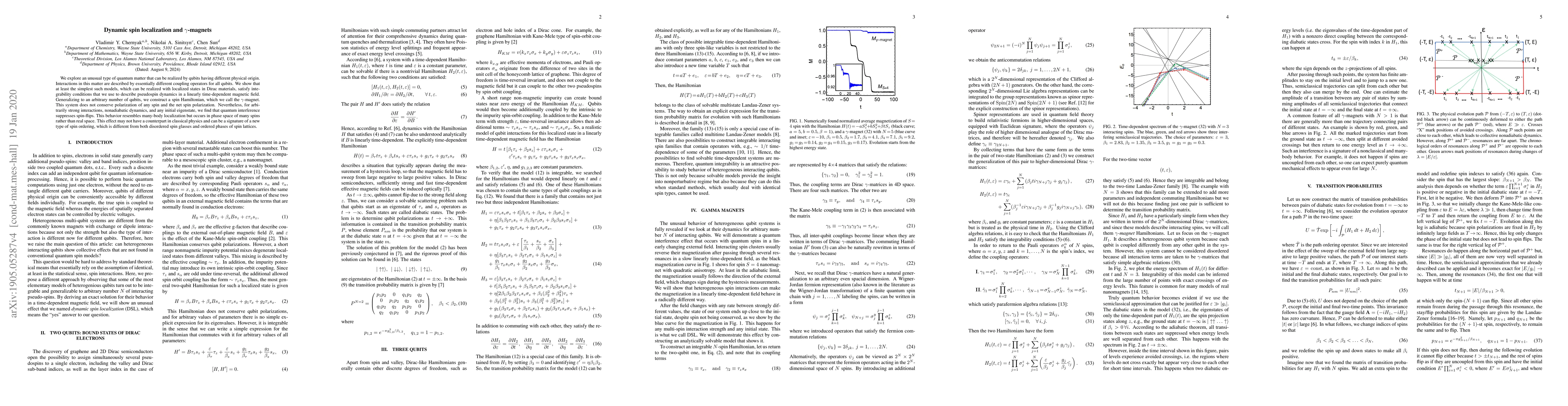 We explore an unusual type of quantum matter that can be realized by qubits having different physical origin. Interactions in this matter are described by essentially different coupling operators for all qubits. We show that at least the simplest such models, which can be realized with localized states in Dirac materials, satisfy integrability conditions that we use to describe pseudospin dynamics in a linearly time-dependent magnetic field. Generalizing to an arbitrary number of qubits, we construct a spin Hamiltonian, which we call the gamma-magnet. This system does not conserve polarization of any spin and the net spin polarization. Nevertheless, for arbitrarily strong interactions, nonadiabatic dynamics, and any initial eigenstate, we find that quantum interference suppresses spin-flips. This behavior resembles many-body localization but occurs in phase space of many spins rather than real space. This effect may not have a counterpart in classical physics and can be a signature of a new type of spin ordering, which is different from both disordered spin glasses and ordered phases of spin lattices.