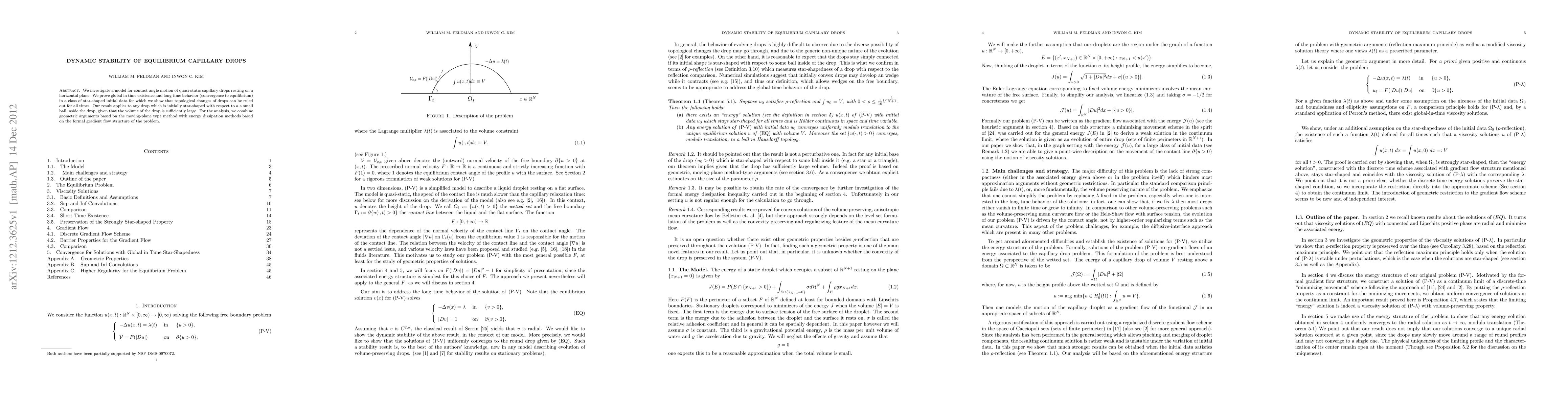 We investigate a model for contact angle motion of quasi-static capillary drops resting on a horizontal plane. We prove global in time existence and long time behavior (convergence to equilibrium) in a class of star-shaped initial data for which we show that topological changes of drops can be ruled out for all times. Our result applies to any drop which is initially star-shaped with respect to a a small ball inside the drop, given that the volume of the drop is sufficiently large. For the analysis, we combine geometric arguments based on the moving-plane type method with energy dissipation methods based on the formal gradient flow structure of the problem.