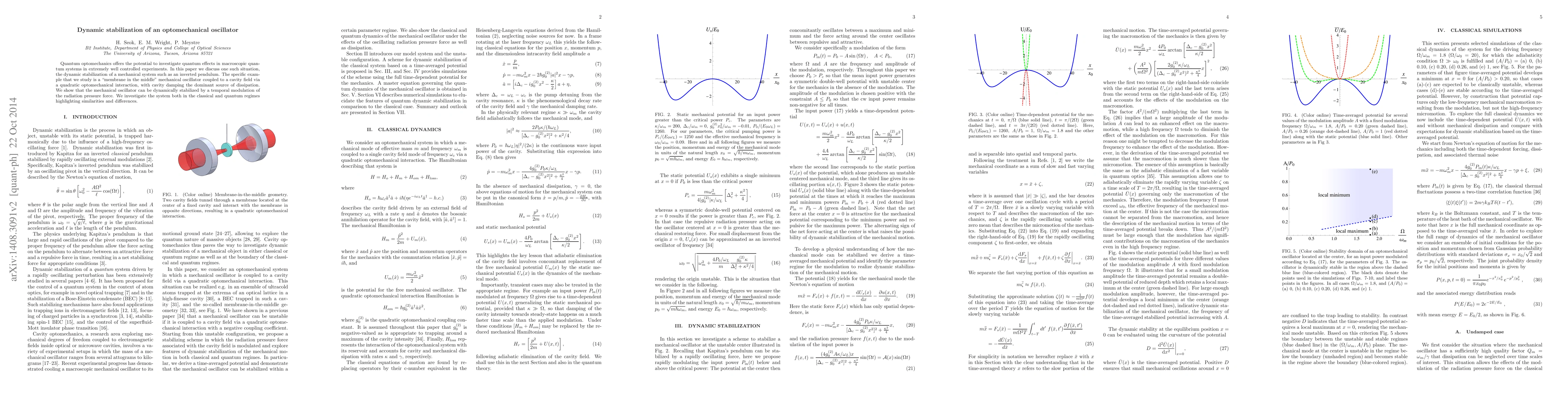 Quantum optomechanics offers the potential to investigate quantum effects in macroscopic quantum systems in extremely well controlled experiments. In this paper we discuss one such situation, the dynamic stabilization of a mechanical system such as an inverted pendulum. The specific example that we study is a "membrane in the middle" mechanical oscillator coupled to a cavity field via a quadratic optomechanical interaction, with cavity damping the dominant source of dissipation. We show that the mechanical oscillator can be dynamically stabilized by a temporal modulation of the radiation pressure force. We investigate the system both in the classical and quantum regimes highlighting similarities and differences.