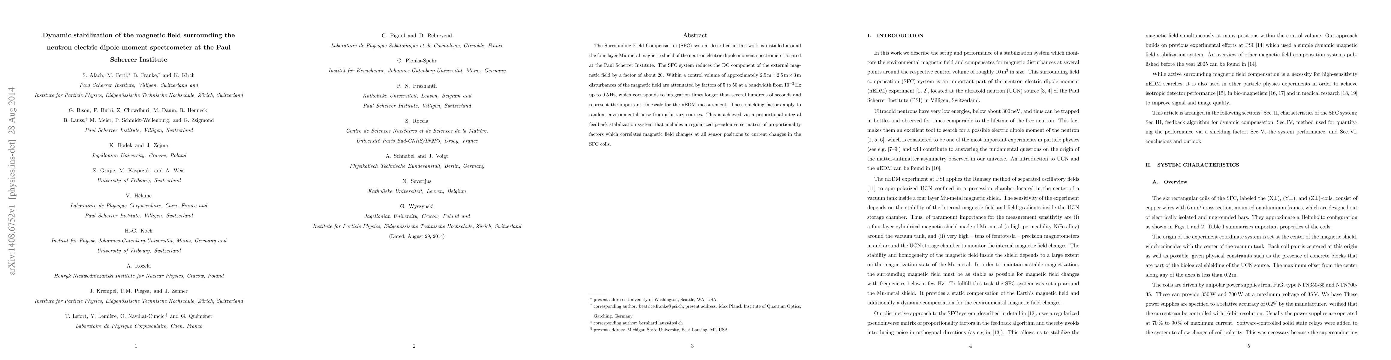 This paper details the implementation of a Surrounding Field Compensation (SFC) system around a neutron electric dipole moment spectrometer at the Paul Scherrer Institute, which significantly reduces the DC component of external magnetic fields and attenuates disturbances by factors of 5 to 50 over a bandwidth relevant to nEDM measurements, utilizing a proportional-integral feedback stabilization system.