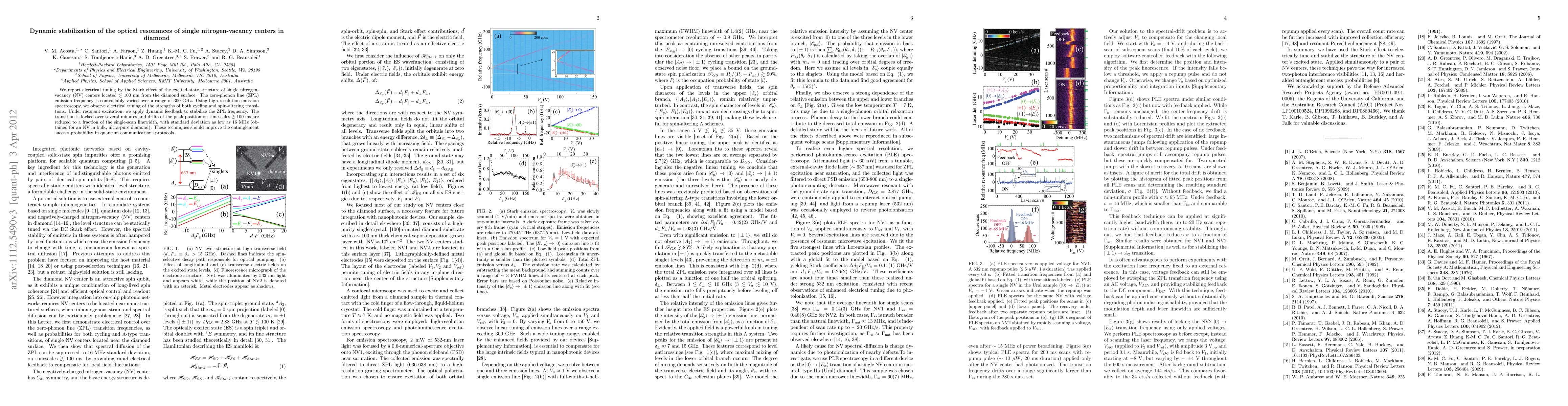 We report electrical tuning by the Stark effect of the excited-state structure of single nitrogen-vacancy (NV) centers located less than ~100 nm from the diamond surface. The zero-phonon line (ZPL) emission frequency is controllably varied over a range of 300 GHz. Using high-resolution emission spectroscopy, we observe electrical tuning of the strengths of both cycling and spin-altering transitions. Under resonant excitation, we apply dynamic feedback to stabilize the ZPL frequency. The transition is locked over several minutes and drifts of the peak position on timescales greater than ~100 ms are reduced to a fraction of the single-scan linewidth, with standard deviation as low as 16 MHz (obtained for an NV in bulk, ultra-pure diamond). These techniques should improve the entanglement success probability in quantum communications protocols.