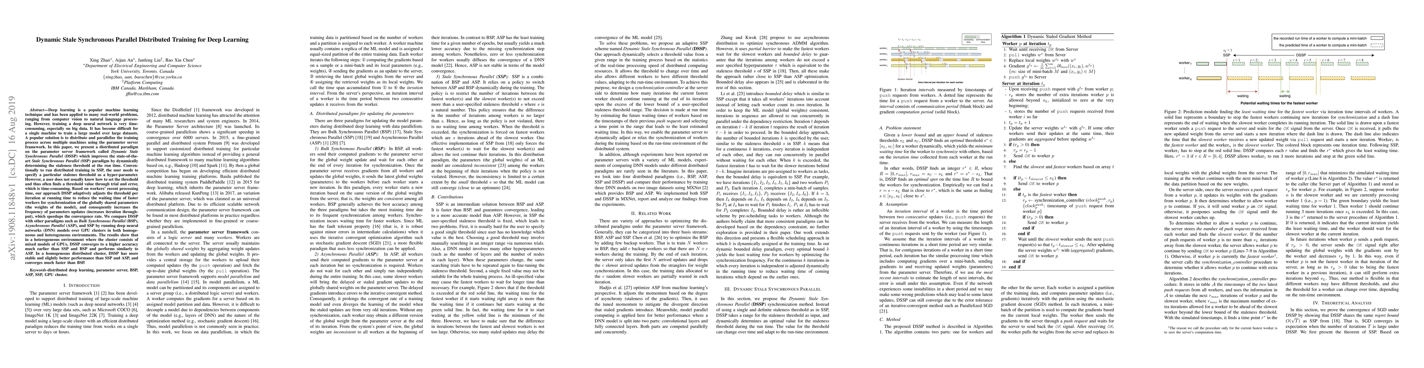 This paper introduces Dynamic Stale Synchronous Parallel (DSSP), a distributed training paradigm that adaptively adjusts the staleness threshold during runtime to enhance the efficiency of parameter updates in deep neural networks. Compared to other paradigms, DSSP shows faster convergence and higher accuracy in heterogeneous environments, and more stable performance in homogeneous environments.