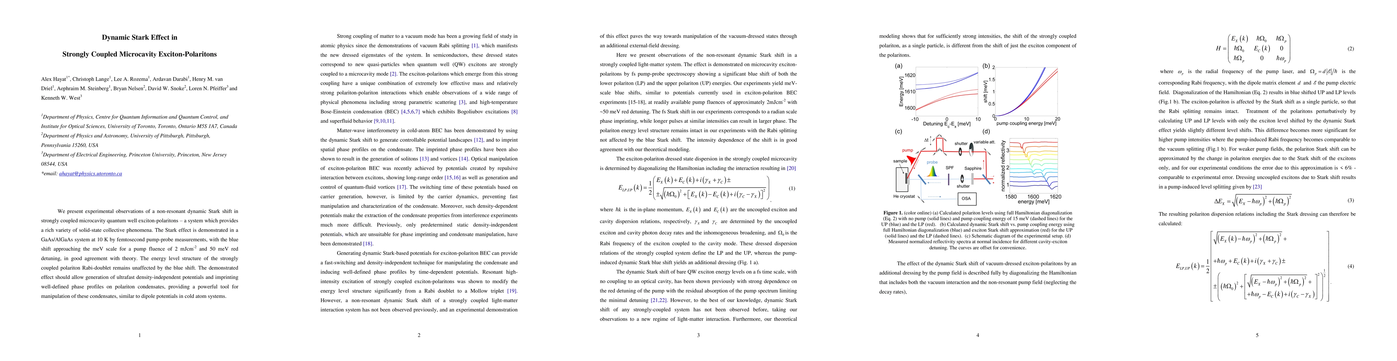 This paper reports experimental evidence of a dynamic Stark effect in strongly coupled microcavity exciton-polaritons, observed via femtosecond pump-probe measurements in a GaAs/AlGaAs system at 10K. The effect results in a blue shift in the energy levels, enabling potential manipulation of polariton condensates akin to dipole potentials in cold atom systems.