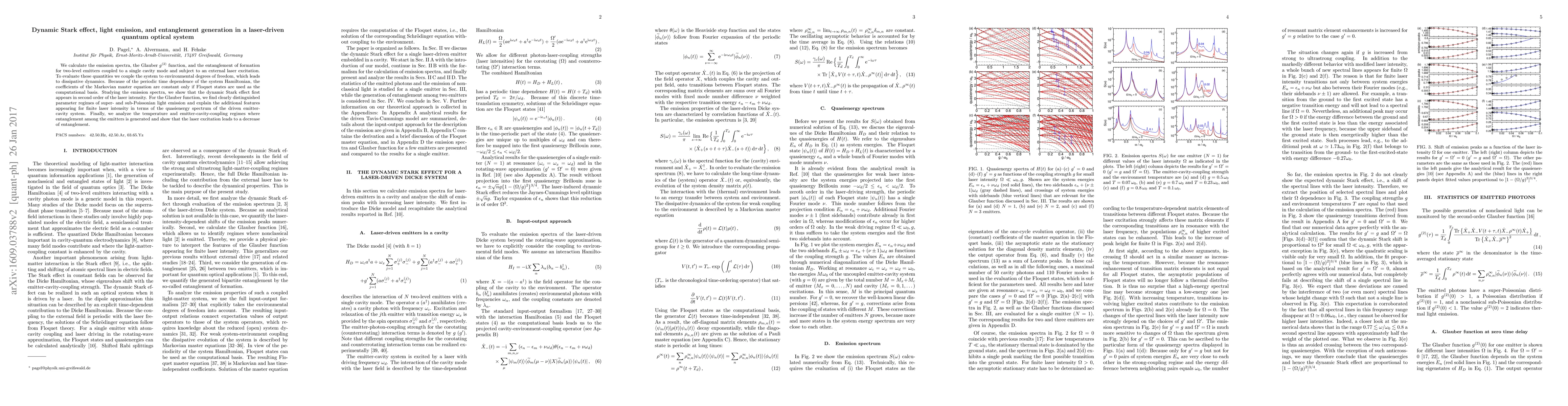 This paper investigates the dynamic Stark effect, light emission, and entanglement generation in a laser-driven quantum optical system of two-level emitters coupled to a cavity. It reveals the shift in spectral lines due to the dynamic Stark effect and identifies regimes for super- and sub-Poissonian light emission, while showing that entanglement decreases with increased laser intensity.