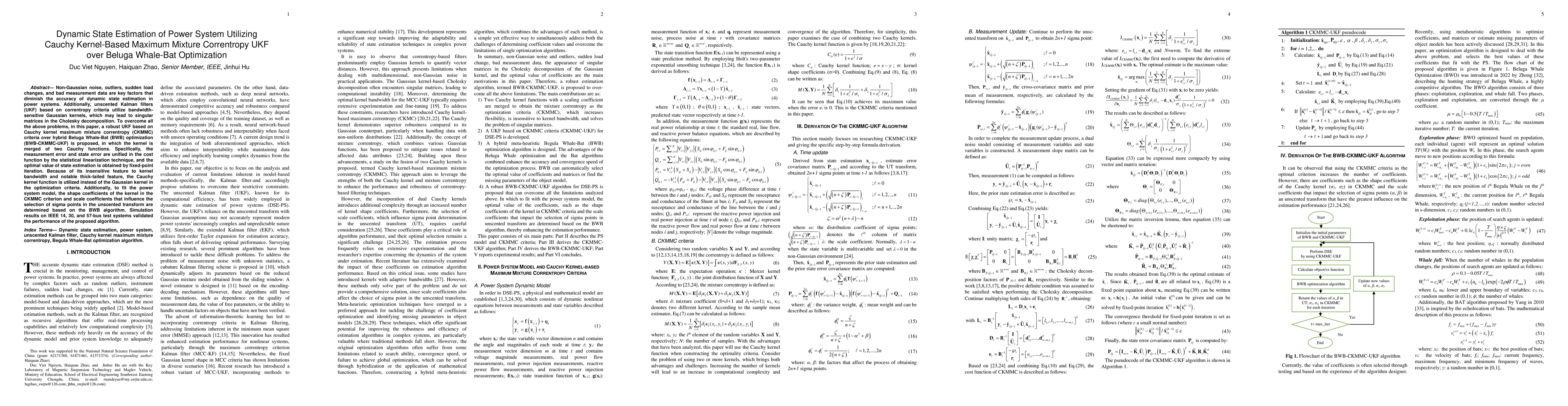 Non-Gaussian noise, outliers, sudden load changes, and bad measurement data are key factors that diminish the accuracy of dynamic state estimation in power systems. Additionally, unscented Kalman filters (UKF) based on correntropy criteria utilize bandwidth-sensitive Gaussian kernels, which may lead to singular matrices in the Cholesky decomposition. To overcome all the above problems, in this paper, a robust UKF based on Cauchy kernel maximum mixture correntropy (CKMMC) criteria over hybrid Beluga Whale-Bat (BWB) optimization (BWB-CKMMC-UKF) is proposed, in which the kernel is merged of two Cauchy functions. Specifically, the measurement error and state error are unified in the cost function by the statistical linearization technique, and the optimal value of state estimation is obtained by fixed-point iteration. Because of its insensitive feature to kernel bandwidth and notable thick-tailed feature, the Cauchy kernel function is utilized instead of the Gaussian kernel in the optimization criteria. Additionally, to fit the power system model, the shape coefficients of the kernel in the CKMMC criterion and scale coefficients that influence the selection of sigma points in the unscented transform are determined based on the BWB algorithm. Simulation results on IEEE 14, 30, and 57-bus test systems validated the performance of the proposed algorithm.