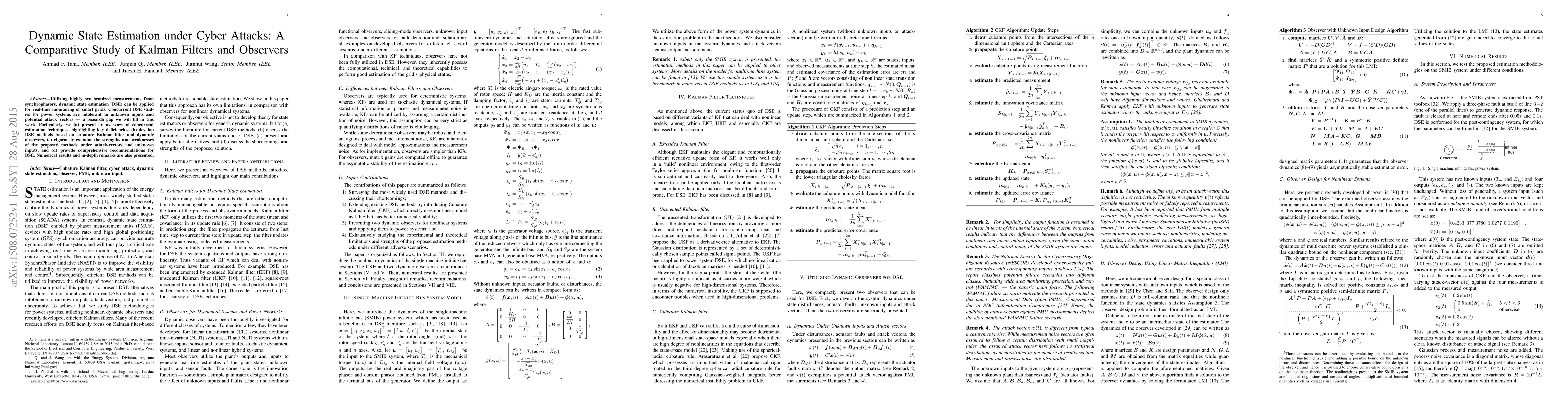 This paper compares Kalman filters and observers for dynamic state estimation in smart grids under cyber attacks, presenting DSE methods based on cubature Kalman filter and dynamic observers. It rigorously evaluates the robustness of these methods against attack vectors and unknown inputs, providing recommendations for resilient DSE.