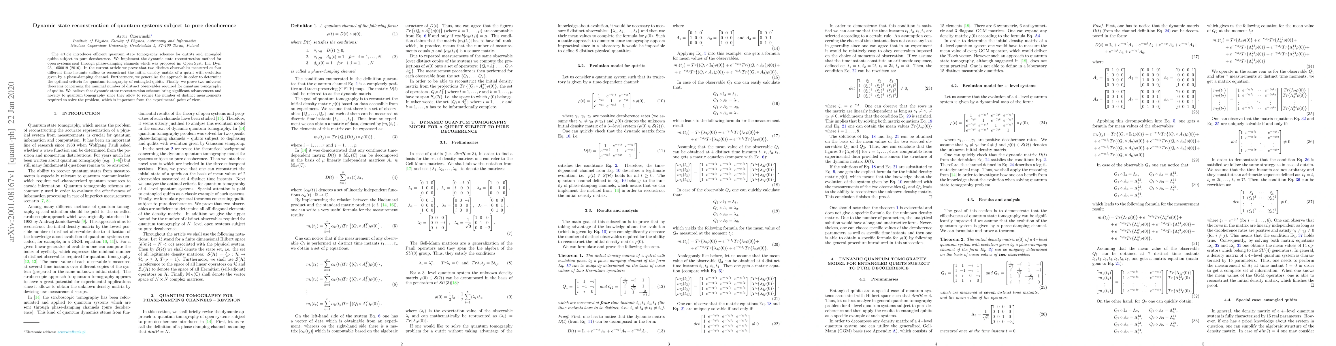 The article introduces efficient quantum state tomography schemes for qutrits and entangled qubits subject to pure decoherence. We implement the dynamic state reconstruction method for open systems sent through phase-damping channels which was proposed in: Open Syst. Inf. Dyn. 23, 1650019 (2016). In the current article we prove that two distinct observables measured at four different time instants suffice to reconstruct the initial density matrix of a qutrit with evolution given by a phase-damping channel. Furthermore, we generalize the approach in order to determine the optimal criteria for quantum tomography of entangled qubits. Finally, we prove two universal theorems concerning the minimal number of distinct observables required for quantum tomography of qudits. We believe that dynamic state reconstruction schemes bring significant advancement and novelty to quantum tomography since they allow to reduce the number of distinct measurements required to solve the problem, which is important from the experimental point of view.