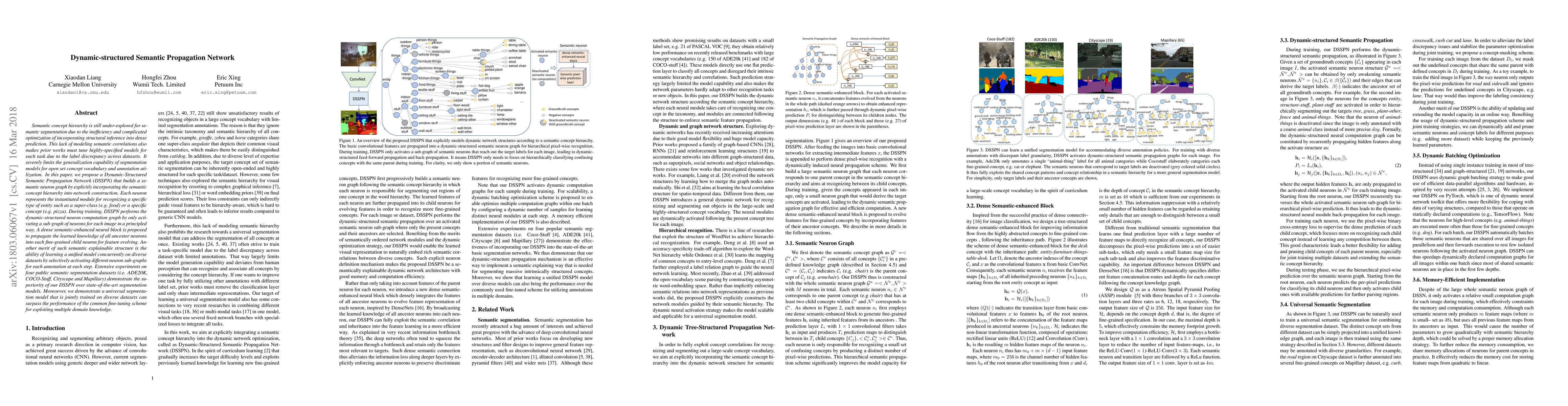 This paper introduces Dynamic-Structured Semantic Propagation Network (DSSPN), which integrates semantic concept hierarchy into network construction for semantic segmentation. DSSPN dynamically activates neuron sub-graphs for each image and dataset, improving generalization capability and performance on multiple datasets, outperforming existing segmentation models.
