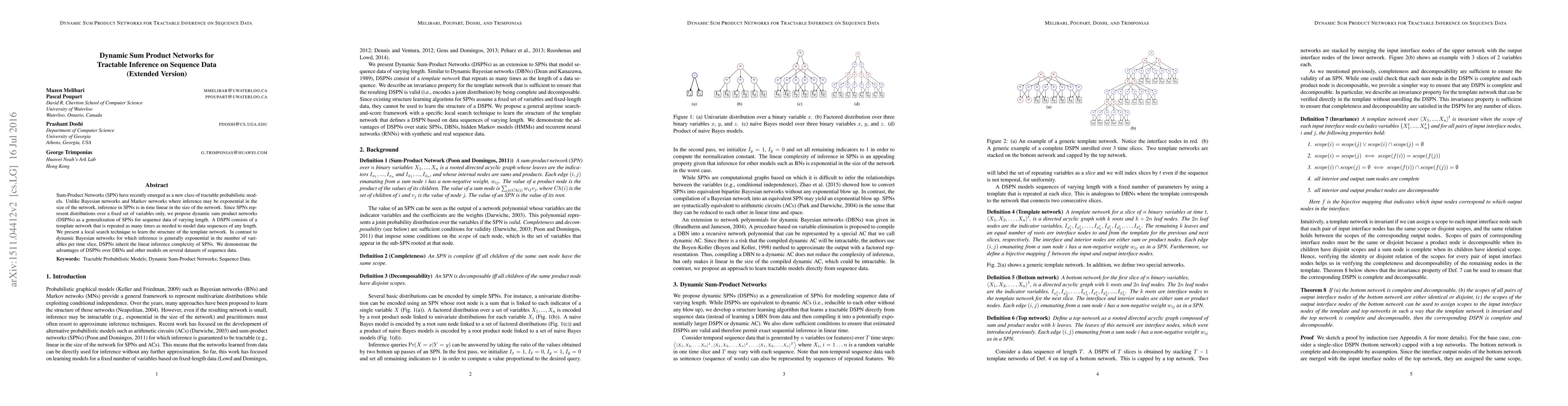 This paper proposes Dynamic Sum Product Networks (DSPNs) to handle sequence data of varying lengths efficiently. DSPNs generalize Sum-Product Networks (SPNs) by repeating a template network, maintaining linear inference complexity, and demonstrating superior performance over Dynamic Bayesian Networks (DBNs) on sequence data datasets.