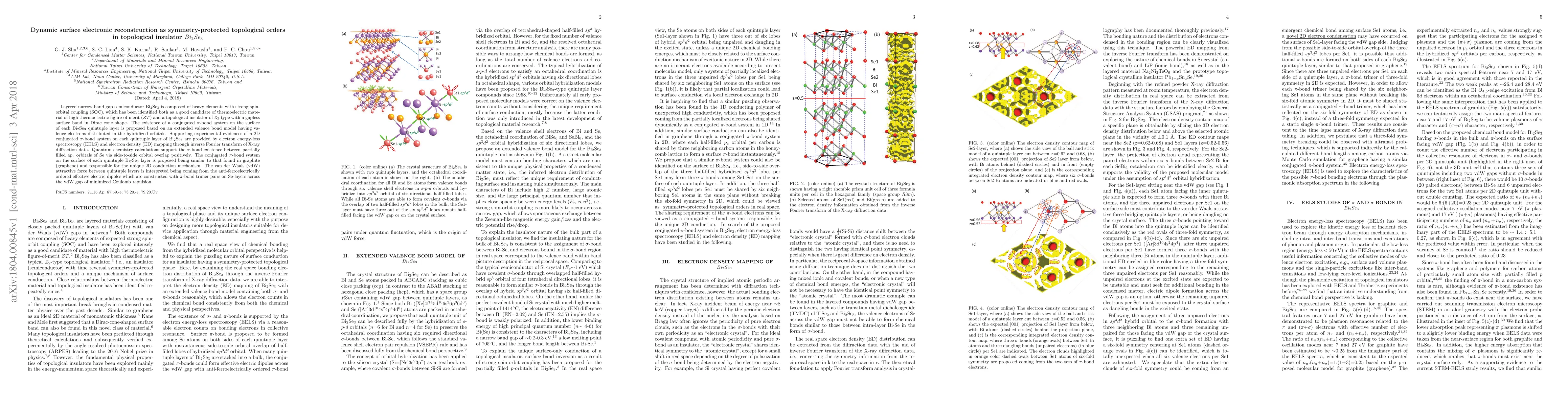 This paper investigates the dynamic surface electronic reconstruction of Bi2Se3, identifying it as a topological insulator with a 2D conjugated pi-bond system on its surface layers. Experimental evidence and quantum chemistry calculations support the existence of this pi-bond system, which is crucial for its unique 2D conduction mechanism and van der Waals interactions between layers.