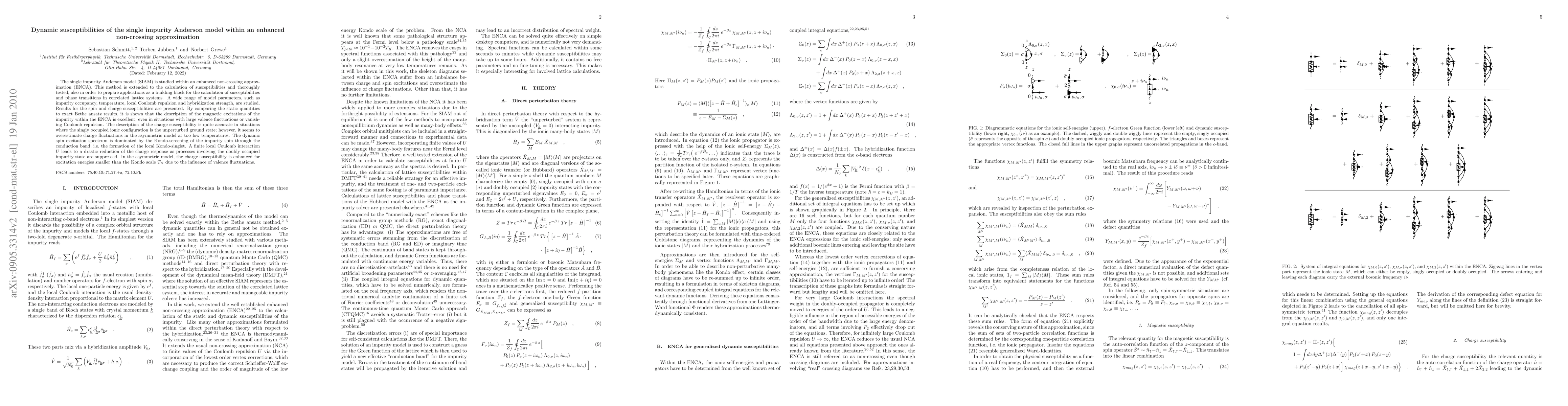 This paper investigates the single impurity Anderson model using an enhanced non-crossing approximation, presenting results for spin and charge susceptibilities. The method effectively captures magnetic excitations even under large valence fluctuations, though it slightly overestimates charge fluctuations in asymmetric models at low temperatures.