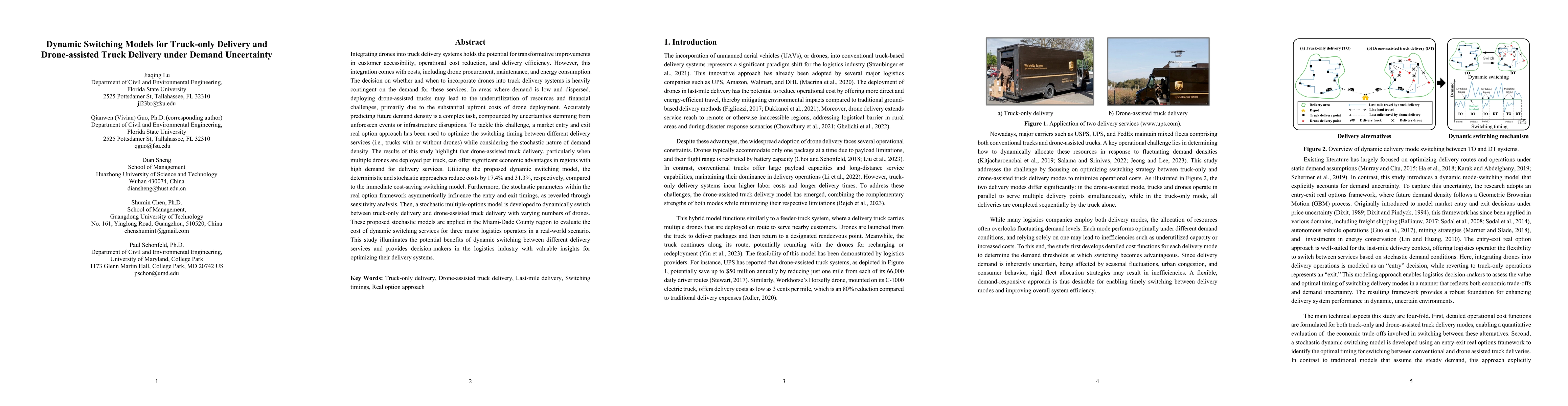 Integrating drones into truck delivery systems can improve customer accessibility, reduce operational costs, and increase delivery efficiency. However, drone deployment incurs costs, including procurement, maintenance, and energy consumption, and its benefits depend on service demand. In low-demand areas, drone-assisted trucks may underutilize resources due to high upfront costs. Accurately predicting demand is challenging due to uncertainties from unforeseen events or infrastructure disruptions. To address this, a market entry and exit real option approach is used to optimize switching between truck-only and drone-assisted delivery under stochastic demand. Results show that deploying multiple drones per truck offers significant cost advantages in high-demand regions. Using the proposed dynamic switching model, deterministic and stochastic approaches reduce costs by 17.4% and 31.3%, respectively, compared to immediate cost-saving switching. Sensitivity analysis reveals asymmetric effects of stochastic parameters on entry and exit timings. A stochastic multiple-options model is further developed to dynamically switch between truck-only and drone-assisted delivery with varying drone numbers. Applying these models to Miami-Dade County, we evaluate dynamic switching costs for three major logistics operators. This study highlights the potential benefits of dynamic delivery switching and provides insights for optimizing logistics operations.