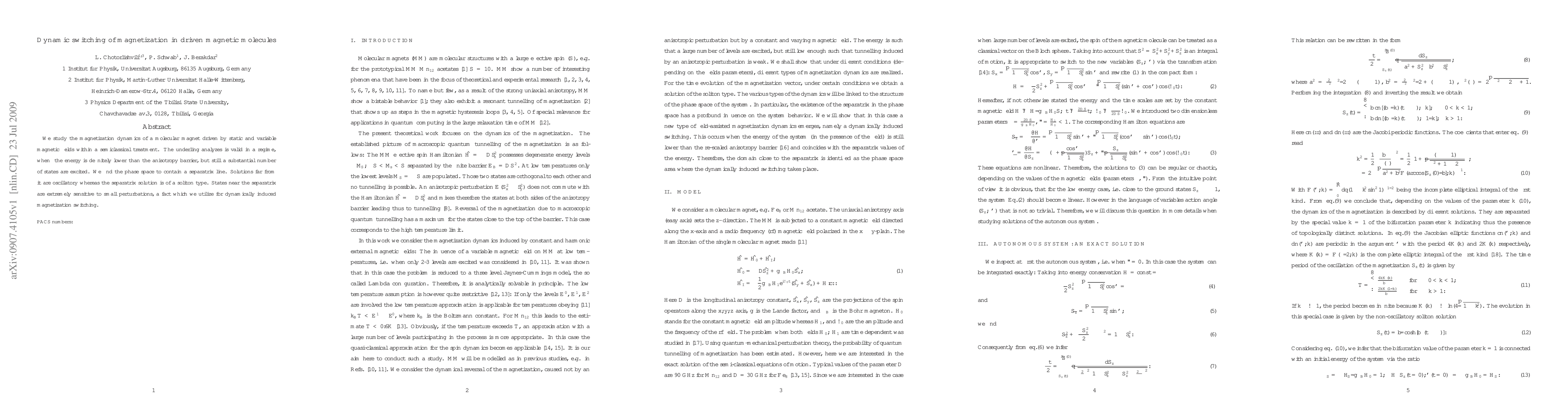 This paper examines the magnetization dynamics of driven magnetic molecules, finding a separatrix line in phase space that distinguishes oscillatory states from soliton-type solutions. The study reveals extreme sensitivity near the separatrix, enabling dynamic magnetization switching via small perturbations.