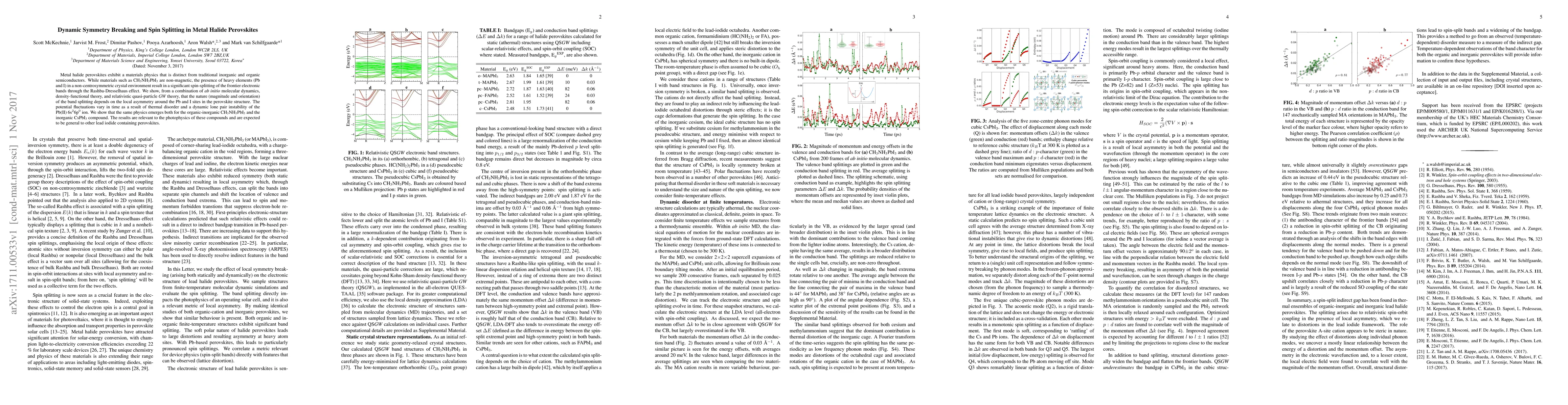 Metal halide perovskites exhibit a materials physics that is distinct from traditional inorganic and organic semiconductors. While materials such as CH3NH3PbI3 are non-magnetic, the presence of heavy elements (Pb and I) in a non-centrosymmetric crystal environment result in a significant spin-splitting of the frontier electronic bands through the Rashba-Dresselhaus effect. We show, from a combination of \textit{ab initio} molecular dynamics, density-functional theory, and relativistic quasi-particle \textit{GW} theory, that the nature (magnitude and orientation) of the band splitting depends on the local asymmetry around the Pb and I sites in the perovskite structure. The potential fluctuations vary in time as a result of thermal disorder and a dynamic lone pair instability of the Pb(II) 6s$^{2}$6p$^{0}$ ion. We show that the same physics emerges both for the organic-inorganic CH3NH3PbI3 and the inorganic CsPbI3 compound. The results are relevant to the photophysics of these compounds and are expected to be general to other lead iodide containing perovskites.