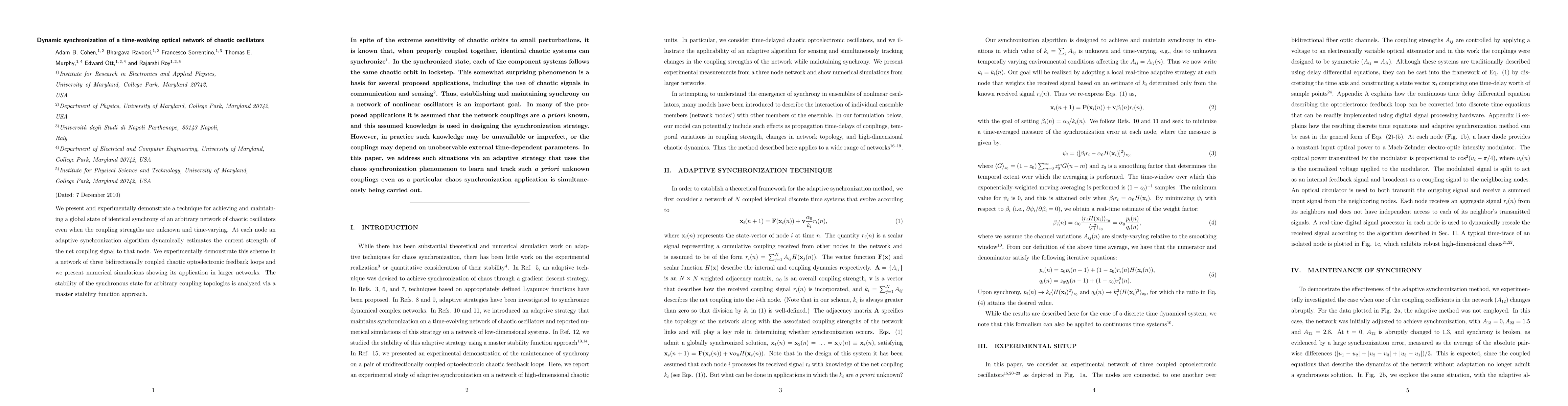 We present and experimentally demonstrate a technique for achieving and maintaining a global state of identical synchrony of an arbitrary network of chaotic oscillators even when the coupling strengths are unknown and time-varying. At each node an adaptive synchronization algorithm dynamically estimates the current strength of the net coupling signal to that node. We experimentally demonstrate this scheme in a network of three bidirectionally coupled chaotic optoelectronic feedback loops and we present numerical simulations showing its application in larger networks. The stability of the synchronous state for arbitrary coupling topologies is analyzed via a master stability function approach.