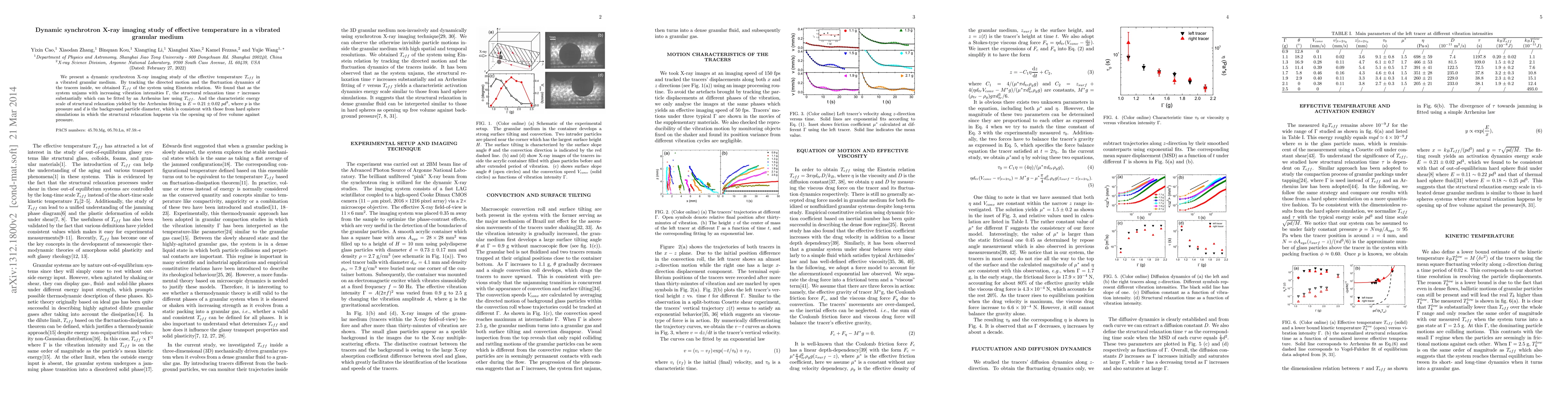 We present a dynamic synchrotron X-ray imaging study of the effective temperature $T_{eff}$ in a vibrated granular medium. By tracking the directed motion and the fluctuation dynamics of the tracers inside, we obtained $T_{eff}$ of the system using Einstein relation. We found that as the system unjams with increasing vibration intensities $\Gamma$, the structural relaxation time $\tau$ increases substantially which can be fitted by an Arrhenius law using $T_{eff}$. And the characteristic energy scale of structural relaxation yielded by the Arrhenius fitting is $E = 0.21 \pm 0.02$ $pd^3$, where $p$ is the pressure and $d$ is the background particle diameter, which is consistent with those from hard sphere simulations in which the structural relaxation happens via the opening up of free volume against pressure.