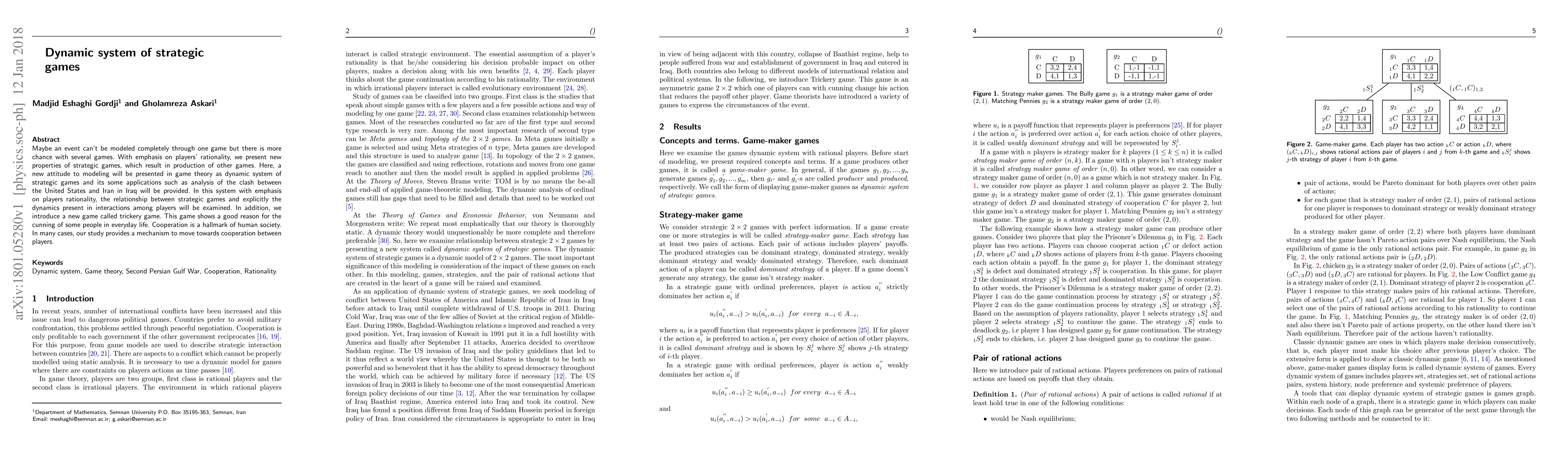 This paper introduces a dynamic system of strategic games emphasizing players' rationality, presenting new game properties and applications, including an analysis of U.S.-Iran interactions in Iraq. It also introduces a "trickery game" to illustrate human cunning and proposes mechanisms to foster cooperation among players.