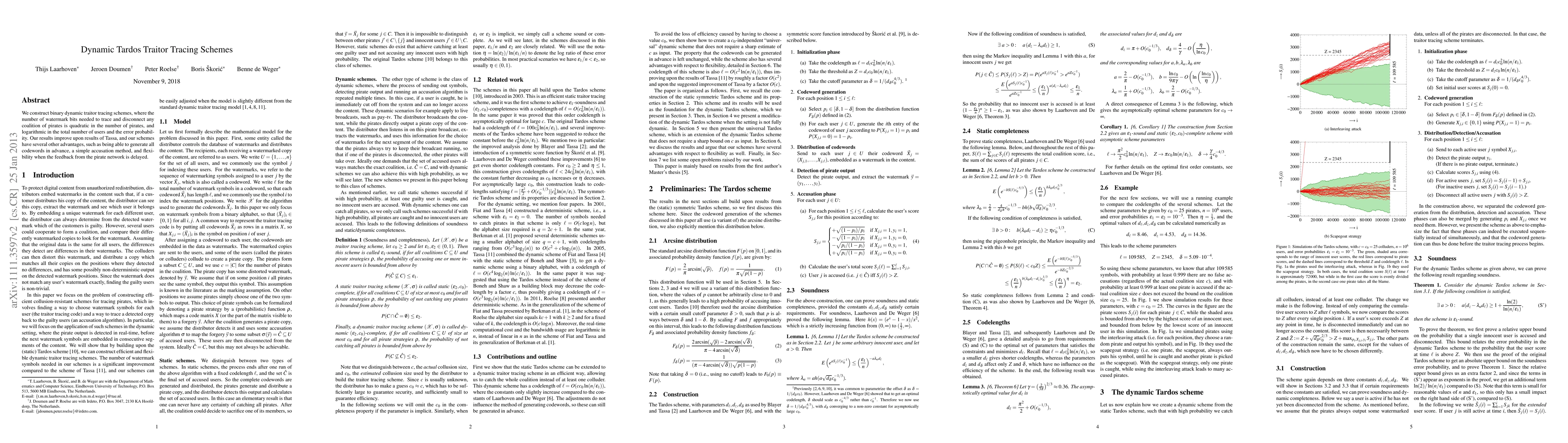 We construct binary dynamic traitor tracing schemes, where the number of watermark bits needed to trace and disconnect any coalition of pirates is quadratic in the number of pirates, and logarithmic in the total number of users and the error probability. Our results improve upon results of Tassa, and our schemes have several other advantages, such as being able to generate all codewords in advance, a simple accusation method, and flexibility when the feedback from the pirate network is delayed.