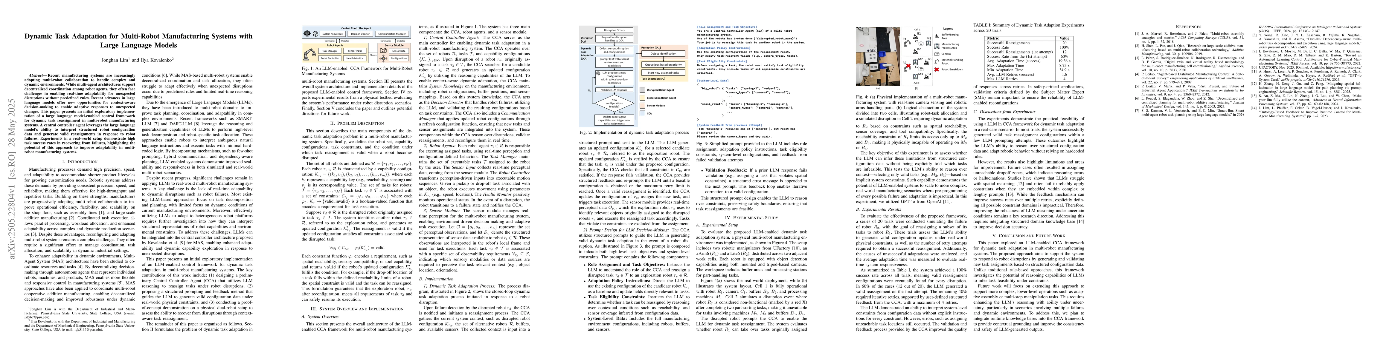 A new control framework using large language models enhances adaptability in multi-robot manufacturing systems by allowing real-time task reassignment after failures. This approach achieved high success rates in recovering from disruptions in a real-world setup.