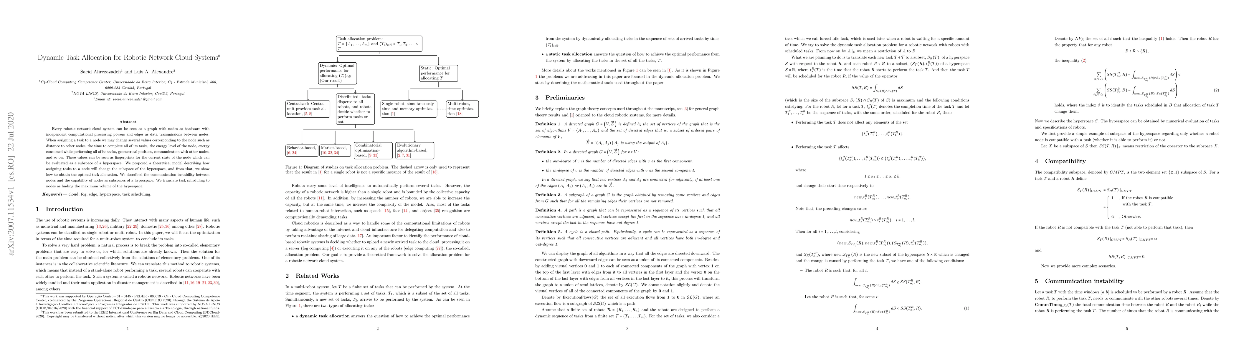 This paper proposes a theoretical model for dynamic task allocation in robotic network cloud systems, where nodes are represented as computational nodes with varying states. The model evaluates how task assignments alter the nodes' state subspaces within a hyperspace, aiming to optimize task allocation by finding the maximum volume of this hyperspace.