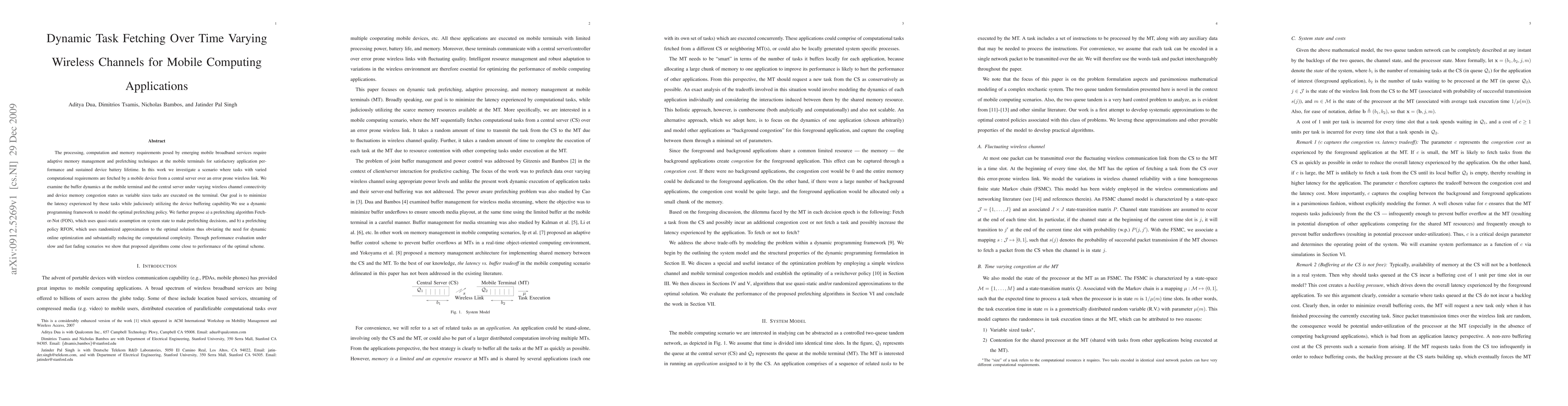 The processing, computation and memory requirements posed by emerging mobile broadband services require adaptive memory management and prefetching techniques at the mobile terminals for satisfactory application performance and sustained device battery lifetime. In this work we investigate a scenario where tasks with varied computational requirements are fetched by a mobile device from a central server over an error prone wireless link. We examine the buffer dynamics at the mobile terminal and the central server under varying wireless channel connectivity and device memory congestion states as variable sizes tasks are executed on the terminal. Our goal is to minimize the latency experienced by these tasks while judiciously utilizing the device buffering capability. We use a dynamic programming framework to model the optimal prefetching policy. We further propose a) a prefetching algorithm Fetch-or- Not (FON), which uses quasi-static assumption on system state to make prefetching decisions, and b) a prefetching policy RFON, which uses randomized approximation to the optimal solution thus obviating the need for dynamic online optimization and substantially reducing the computational complexity. Through performance evaluation under slow and fast fading scenarios we show that proposed algorithms come close to performance of the optimal scheme.