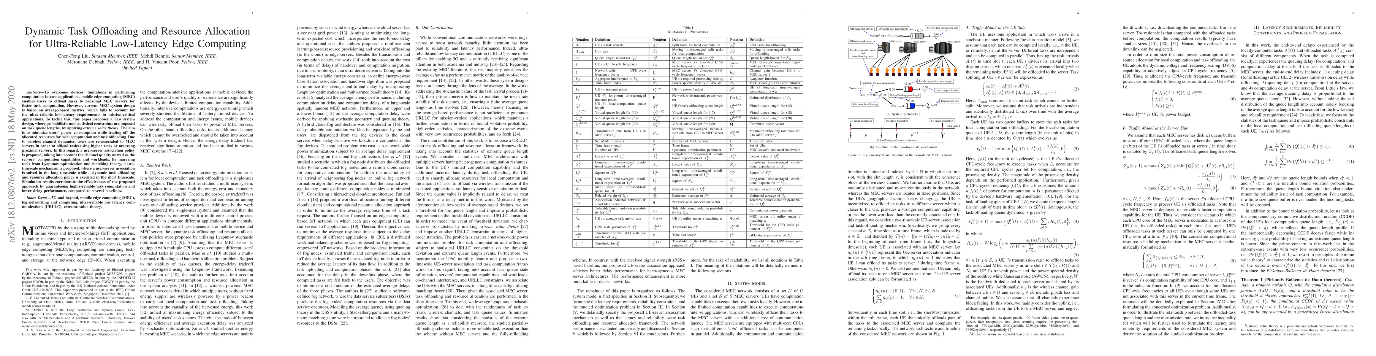 This paper proposes a novel system design for ultra-reliable low-latency edge computing, utilizing extreme value theory and a two-timescale mechanism to dynamically offload tasks to proximal servers while minimizing power consumption and optimizing resource allocation. The approach guarantees highly reliable task computation and lower delays compared to baselines.
