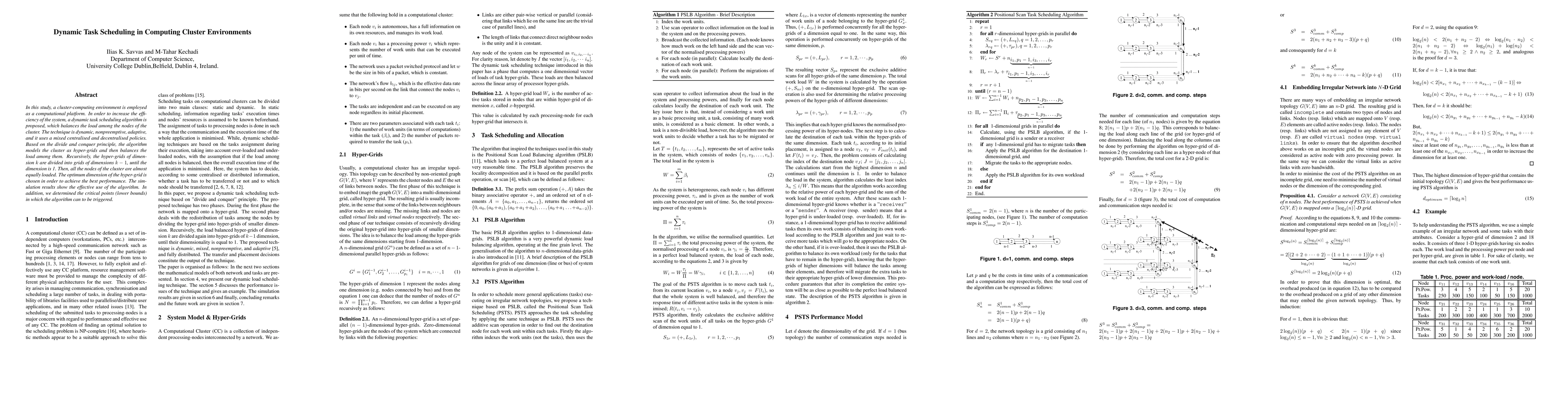 In this study, a cluster-computing environment is employed as a computational platform. In order to increase the efficiency of the system, a dynamic task scheduling algorithm is proposed, which balances the load among the nodes of the cluster. The technique is dynamic, nonpreemptive, adaptive, and it uses a mixed centralised and decentralised policies. Based on the divide and conquer principle, the algorithm models the cluster as hyper-grids and then balances the load among them. Recursively, the hyper-grids of dimension k are divided into grids of dimensions k - 1, until the dimension is 1. Then, all the nodes of the cluster are almost equally loaded. The optimum dimension of the hyper-grid is chosen in order to achieve the best performance. The simulation results show the effective use of the algorithm. In addition, we determined the critical points (lower bounds) in which the algorithm can to be triggered.