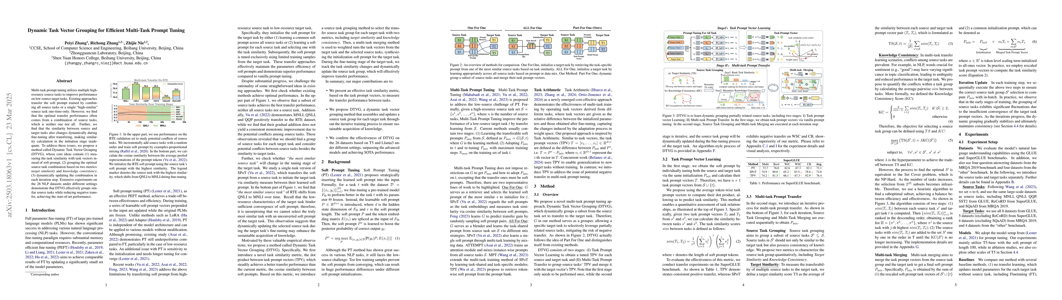 The paper proposes Dynamic Task Vector Grouping (DTVG) for efficient multi-task prompt tuning, which dynamically updates the optimal combination of source tasks based on task similarity and knowledge consistency, achieving state-of-the-art performance across 26 NLP datasets.