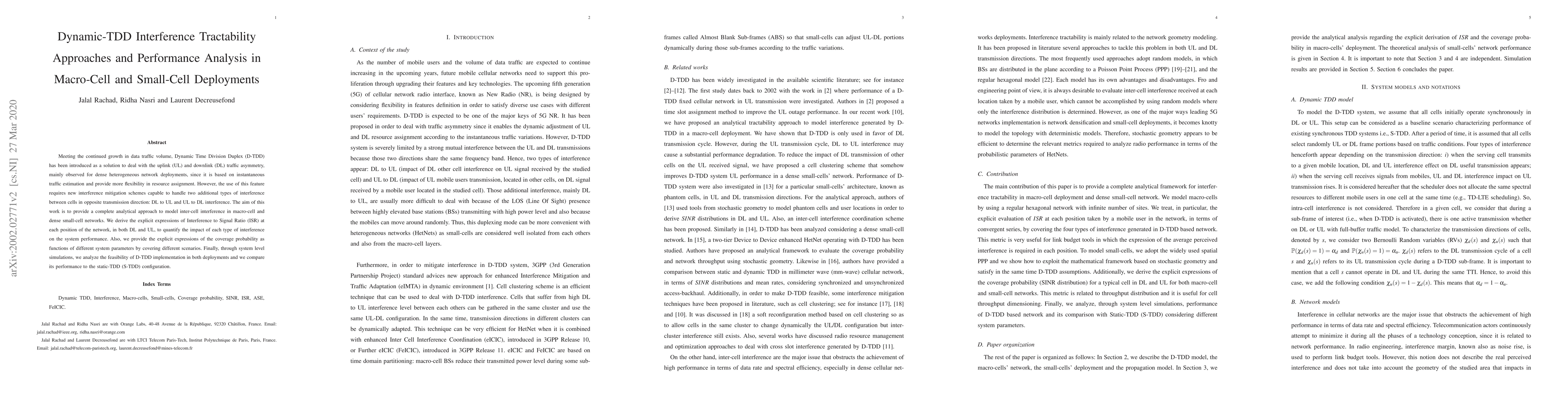 This paper develops analytical models to assess inter-cell interference in macro-cell and small-cell networks using Dynamic Time Division Duplex (D-TDD), deriving expressions for Interference to Signal Ratio and coverage probability. It compares D-TDD's performance against static-TDD through simulations, evaluating its feasibility in different network deployments.